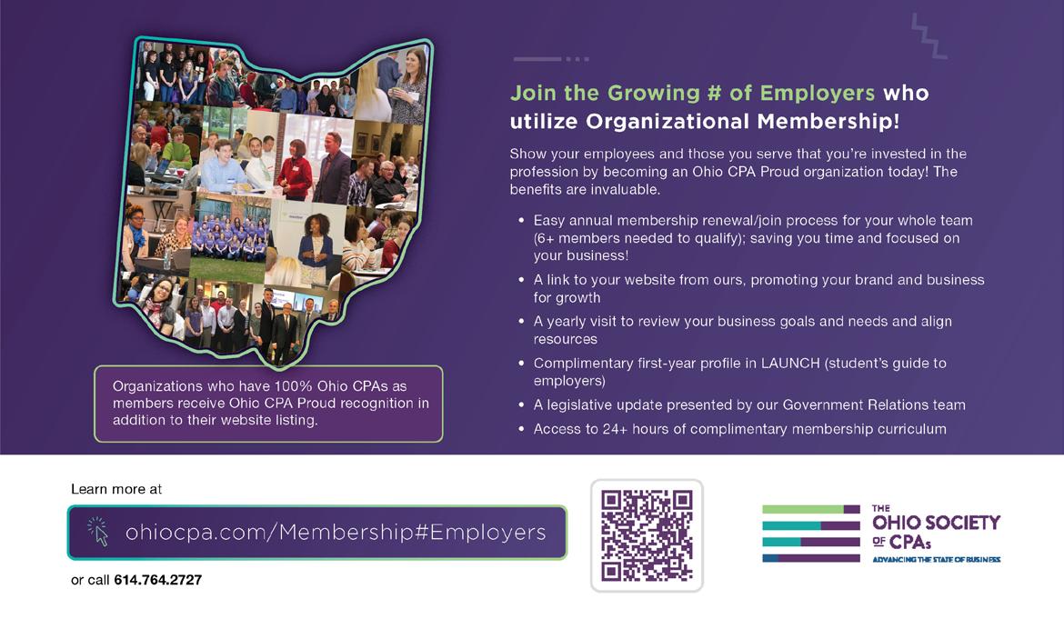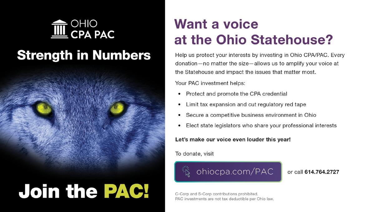 The Ohio Society of CPAs does not guarantee delivery dates for CPA Voice and disclaims all warranties, express or implied, and assumes no responsibility whatsoever for damages incurred as a result of delivery delays. CPA Voice (ISSN 0749-8284) is published six times per year by The Ohio Society of CPAs, 4249 Easton Way, Suite 150, Columbus OH 43219, 614.764.2727.
