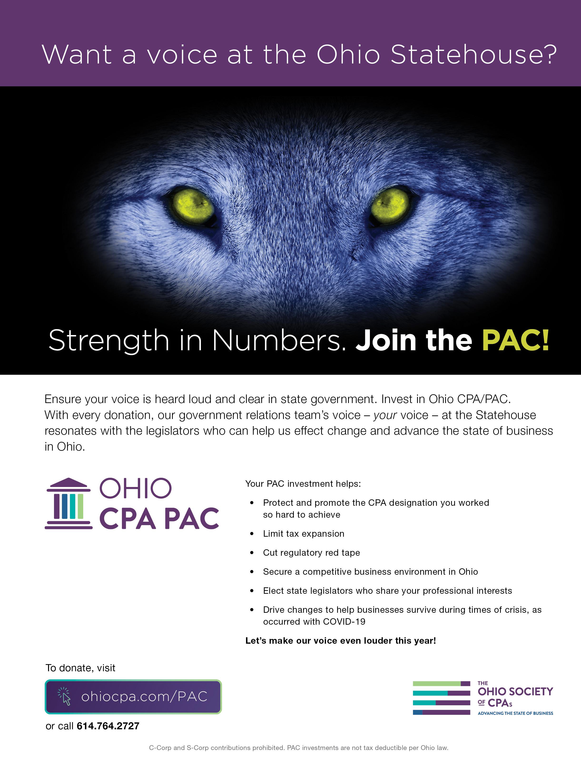 But progress like this doesn’t happen by chance. It happens because our members choose to invest in their profession’s future. The success of the Pathways legislation was made possible through the collective strength of our dedicated team, engaged volunteers and a robust Political Action Committee (PAC). Your PAC contributions amplify the voice of Ohio’s CPAs and empower OSCPA to have a seat at the table—educating policymakers, shaping solutions, and ensuring that the voice of the CPA profession is heard where it matters most.