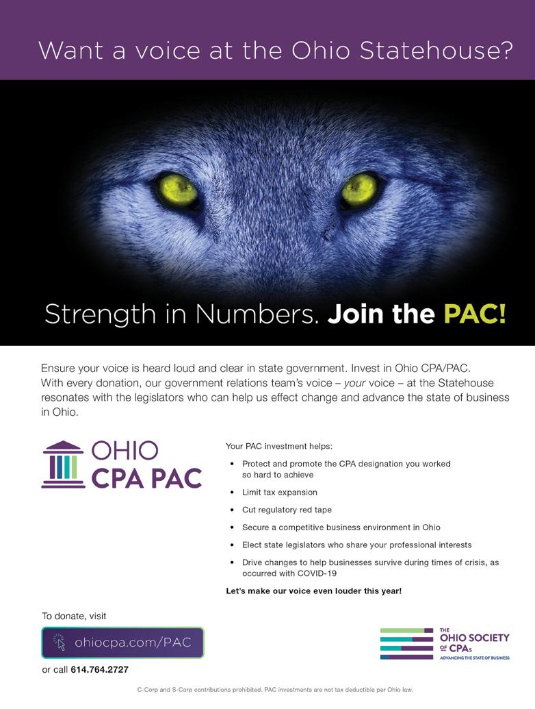 CPA Voice is the official magazine of The Ohio Society of Certified Public Accountants. CPA Voice’s purpose is to serve as the primary news and information vehicle for more than 19,000 Ohio CPA members and related professionals. Articles are reviewed for technical accuracy. However, the materials and information contained within CPA Voice are offered as information only and not as practice, financial, accounting, legal or other professional advice. While we strive to present accurate and reliable information, The Ohio Society of CPAs makes no warranties regarding the accuracy of the information provided herein. Readers are strongly encouraged to conduct appropriate research to determine the accuracy of the information provided and to consult with an appropriate, competent professional adviser before acting on the information contained in this publication. The statements of fact, thoughts, advice and opinions expressed in CPA Voice are those of the authors alone and do not represent or imply the positions, opinions, nor endorsement of The Ohio Society of CPAs or of its publisher, editors, Board of Directors, or members. It is our policy not to knowingly accept advertising that discriminates on the basis of race, religion, gender, age or origin. The Ohio Society of CPAs reserves the right to reject paid advertising in its sole discretion. We do not necessarily endorse the resources, services or products unrelated to The Ohio Society of CPAs that may appear or be referenced within CPA Voice, and make no representation or warranties about those products or services or the accuracy and claims regarding those products and services. Advertisers and their agencies assume liability for all advertisement content and responsibility for all claims resulting from such advertisements made against The Ohio Society of CPAs.