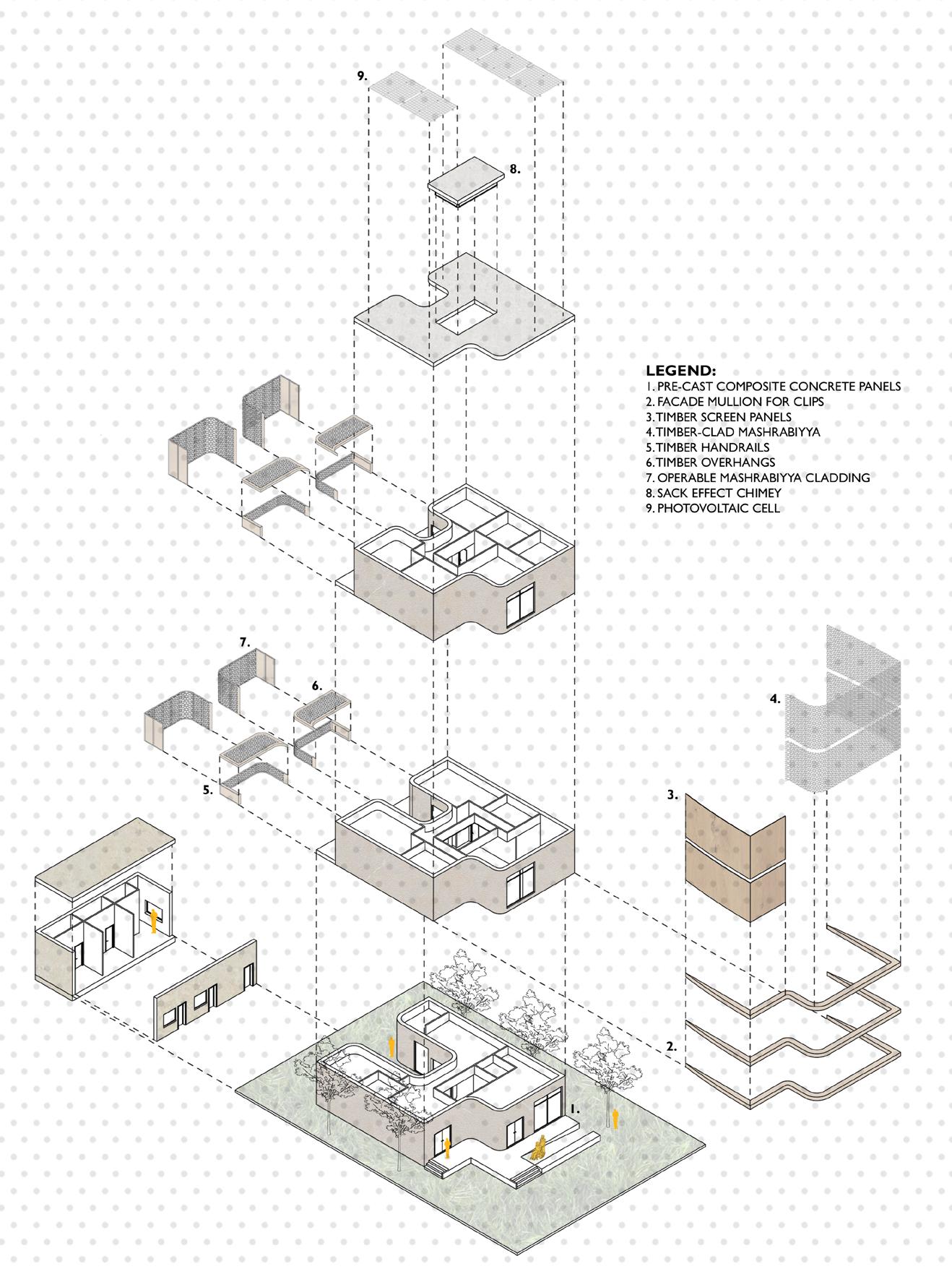 Dubai was once a port town that stood in between the Gulf of Persia and the Rub al-Khali. Since then, the value of family and tradition has stood firm within its people and has created the foundation on which the Emirate stands upon. Each of these values are interwoven together, creating a harmony in the relationships among family members and their community. Similar to the image we see when the desert and the sea would surround the city, each value is weaved with one another to embrace the people that hold them. Therefore, in the Shatt Al-Karam housing we embody these values by incorporating the culturally-significant mashrabiyya patterns in the primary facade system to greet the guests and in the courtyard where the family gathers.