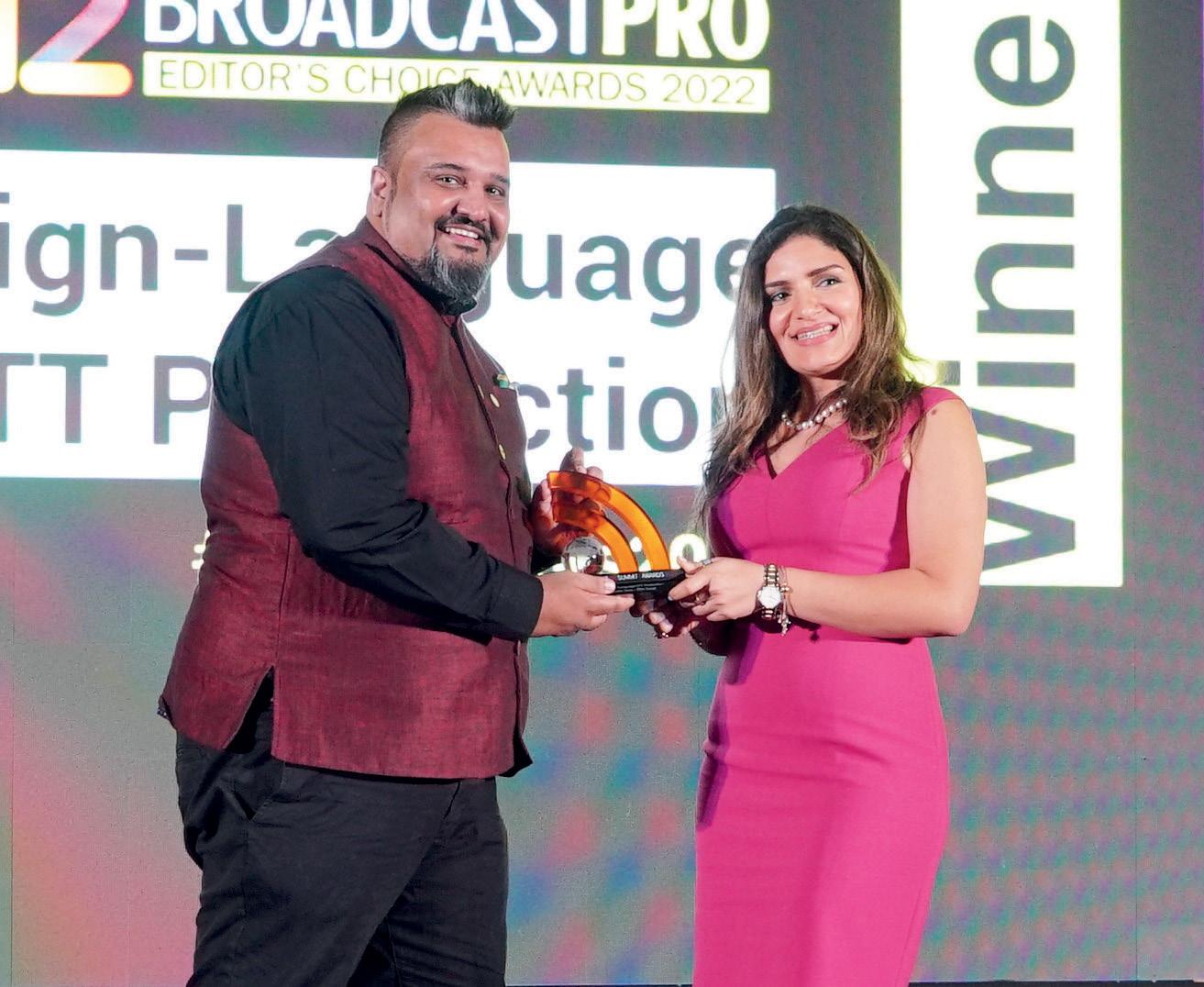 The MGI team won this award for their work at CNBC Arabia Dubai, where they undertook what appears to be a fairly straightforward migration from standard definition (SD) to high definition (HD). The MGI team, however, had much to contend with as the HQ is a fairly old facility with legacy equipment that was integrated two decades ago. The project, which was initially planned prior to Covid, resumed earlier this year but meticulous planning and collaboration was required to ensure that there were no blackouts, that systems arrived on time from suppliers and the integration was carried out within the tight deadline. The MGI team received the award from Ajay Kumar Meher (r), Global Practice Head, Media & New Media, Tata Elxsi Limited.