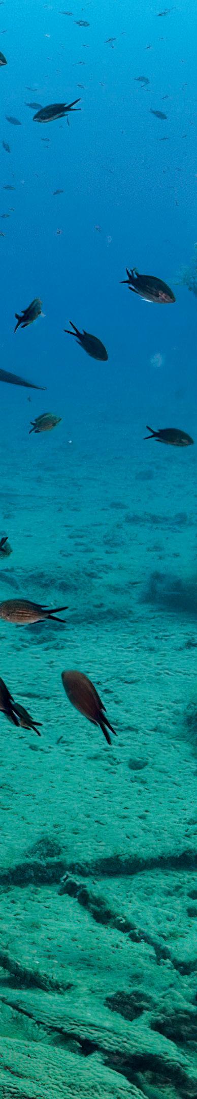 unique challenges,” notes Yildiz. “Light and colour change dramatically with depth. Without proper lighting, the environment turns monochromatically blue or indigo. Red light is absorbed first, vanishing at depths of less than 15 feet, making red objects appear greyish. As we go deeper, orange and yellow colours then follow, fading away at around 25 feet and 35 feet respectively. Green light persists a bit longer but is absorbed around 65 feet.”