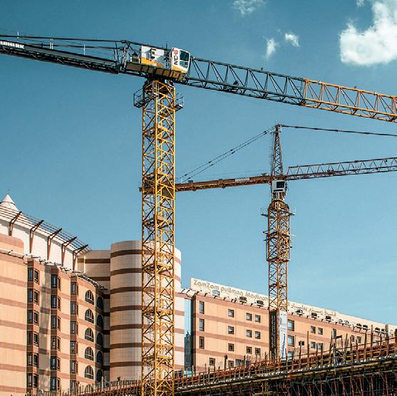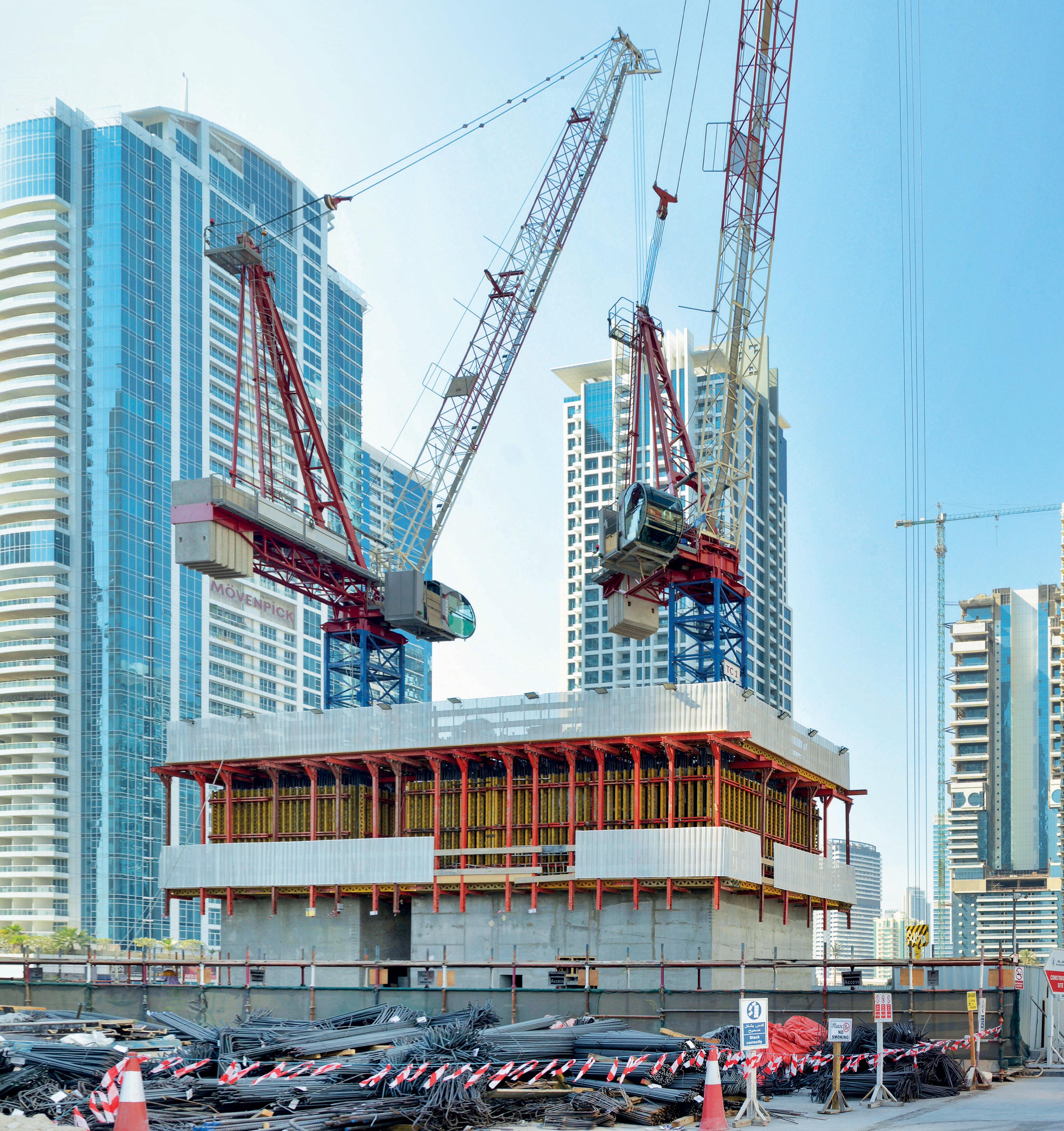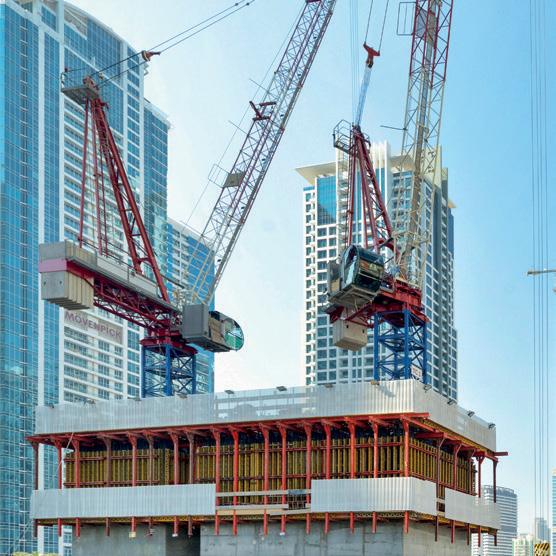 A luffing tower crane is ideal for congested areas, allowing operators to complete the task at hand even when space is limited on either side of the site. It achieves this through its ability to raise or lower its jib, allowing the operator to reduce the slewing radius as a result. The latest example of this comes in one of Dubai’s most vibrant districts, Jumeirah Lake Towers where two new Raimondi LR213s were recently installed for the construction of a 40-storey mixeduse tower. The cranes will remain on site for approximately two years. Upon completion, the new tower will feature 330 residential units alongside commercial spaces.