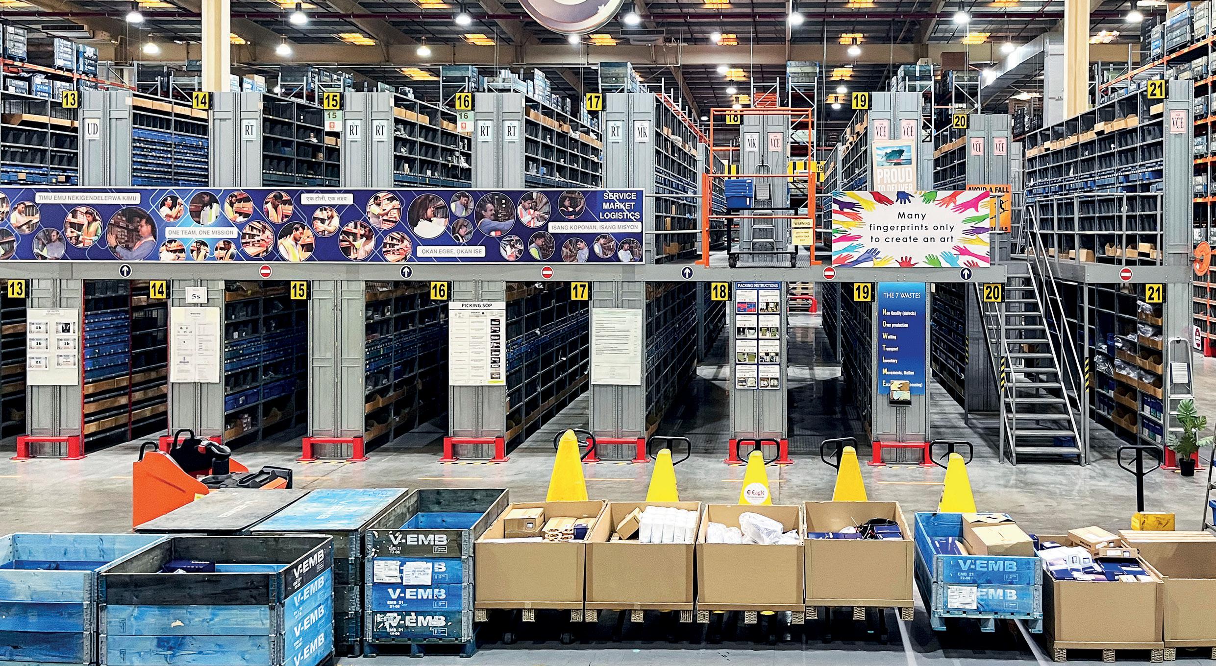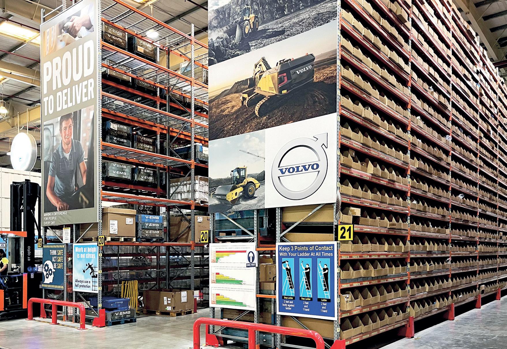 The 8,000 m2 warehouse stocks around 50,000 spare parts for five Volvo entities in the region: Volvo CE, Volvo Trucks, Volvo Buses, Renault Trucks, and Mack Trucks. Volvo CE parts constitute just under a third of the inventory with approximately 12,000 part numbers.
