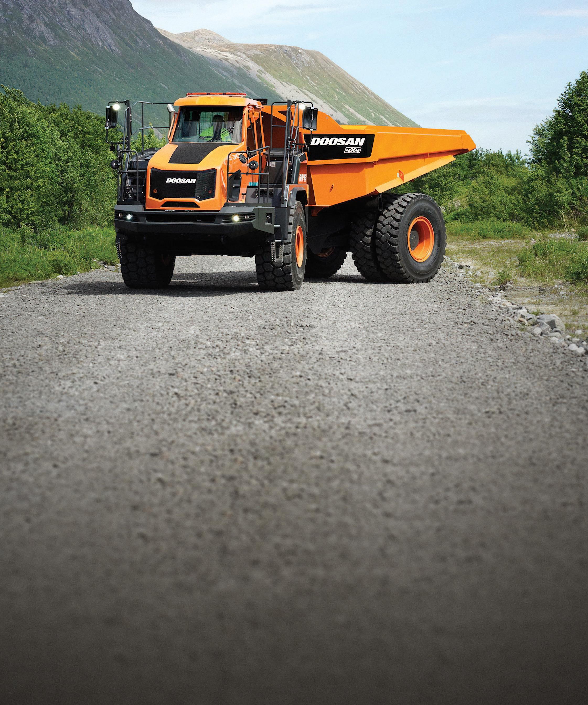 41According to Doosan, its key advantages include having the ability to climb up bigger inclinations than equivalent RDTs, performing better than RDTs in wet and slippery conditions, working without stop in heavy rain, operating effectively on compact sites and causing less ground disturbance than 6x6 configurations.