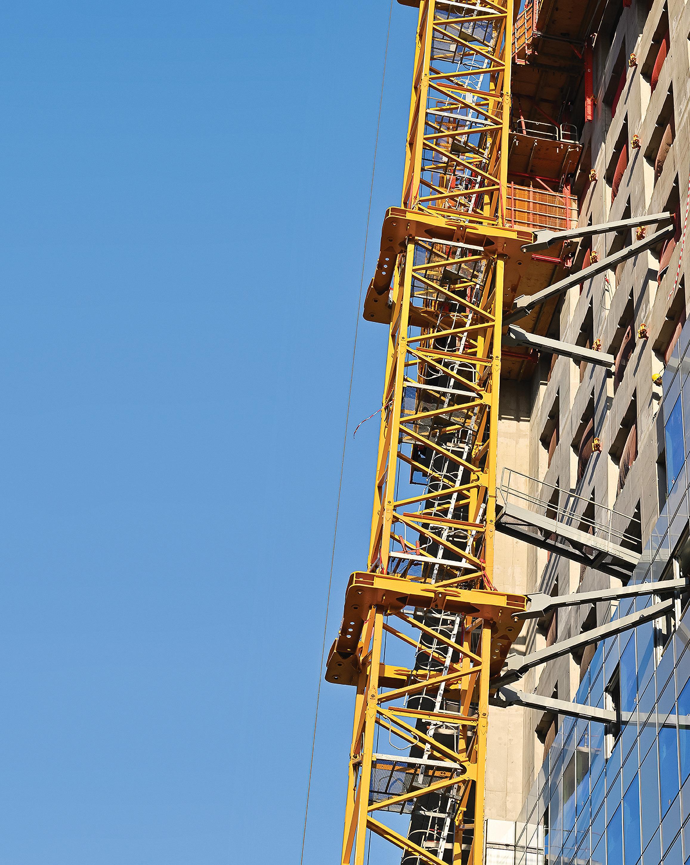 The first Potain MR 295 crane was erected on a Y800 chassis at a freestanding height of 55.8m. It will climb every month until it reaches its final working height of 85.8m, with three anchor points securing it to the building.