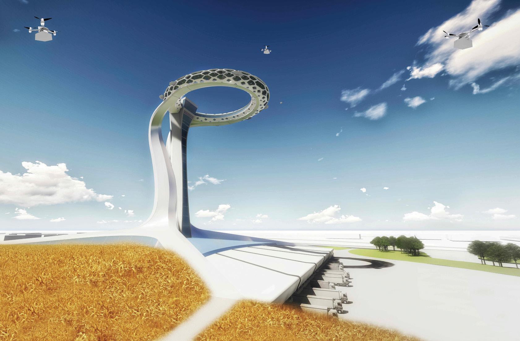 The Droneport of the future has an arch beam supporting the top of the tower instead of a typical vertical structure, making it both lighter and more structurally efficient which greatly minimizes the need for human workings, creating a safer working environment. Malls in the Middle East are accessible from highways and have the potential for online retailers to adapt spaces for maximum fulfilment using elevated drones as the technology advances.