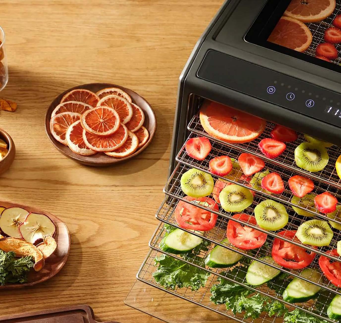 Boasting optimum square feet of drying space to meet all dehydrating needs. With dishwasher safe stainless trays for enough space to dry a variety of foods.