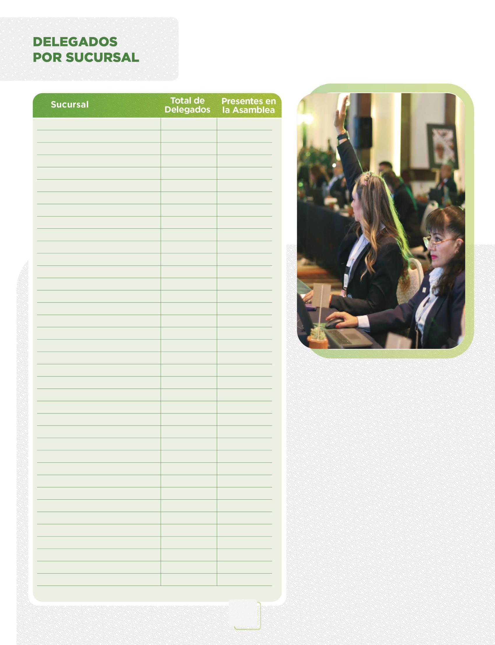 De acuerdo con lo establecido en el artículo 84, inciso l), de las Bases Constitutivas,seconvocaron y organizaron las Asambleas de Sucursal y Plaza, en apego a la normativa vigente, en las que se designó a un representante del Comité para estar presente en las Asambleas de cada Sucursal de Plaza Delicias
