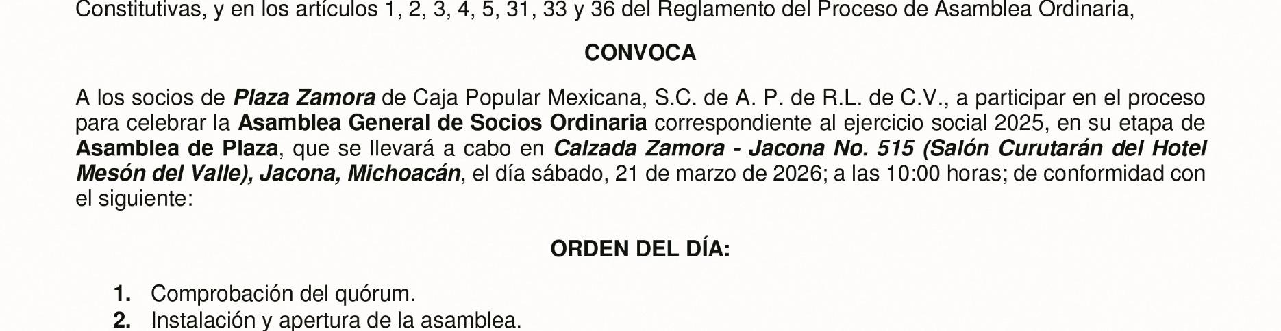 Tal como lo establecen las Bases Constitutivas de Caja Popular Mexicana, esta Asamblea tiene como propósito presentarles las actividades más relevantes, los estados financieros y los planes de desarrollo que se proyectaron y realizaron en el año 2025.