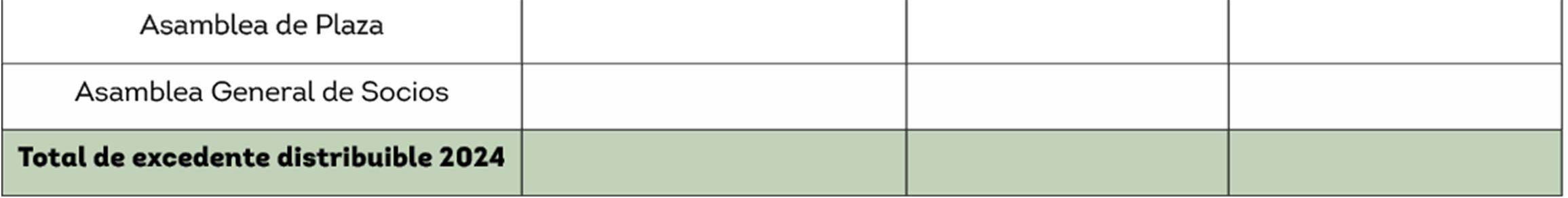 Para la aplicación de excedentes del ejercicio 2024, el Consejo de Administración de Caja Popular Mexicana propone que la parte proporcional del excedente distribuible que se encuentra en facultad de las Asambleas de Sucursal, Plaza y General de Socios cuyo importe asciende a $369’635,496.35 (Trescientos sesenta y nueve millones, seiscientos treinta y cinco mil, cuatrocientos noventa y seis pesos 35/100 M.N.), tenga las siguientes finalidades: