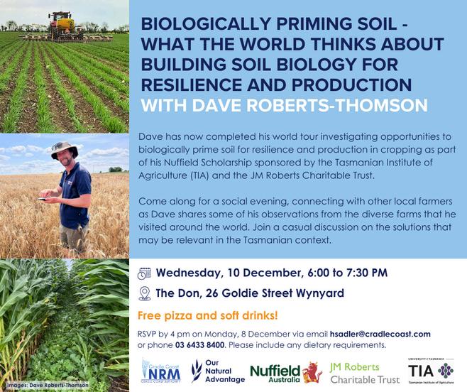 The National Soil Monitoring Program has been supported by funding through the Australian Government Natural Heritage Trust (Department of Agriculture, Fisheries and Forestry) in collaboration with the Commonwealth Scientific and Industrial Research Organisation (CSIRO) Our Cradle Coast NRM staff are conducting soil chemistry, biology and physics samples at 49 pre-determined sites across the Cradle Coast region, with NRM South coordinating the regional delivery by the three NRM regions across Tasmania
