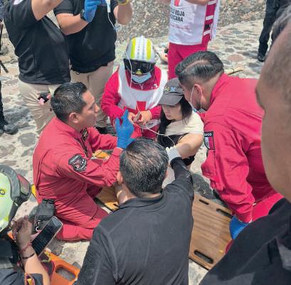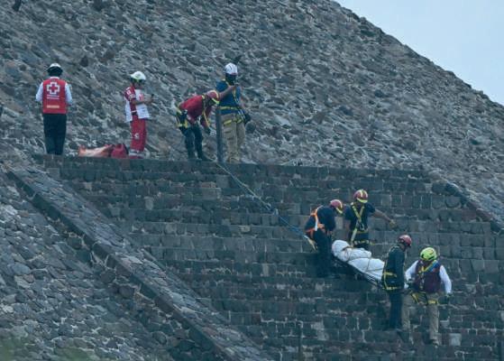 TIROTEO EN LA PIRÁMIDE DE LA LUNA. Un hombre armado desató pánico en la zona arqueológica de Teotihuacán: disparó en contra de turistas que visitaban las pirámides ayer a mediodía; asesinó a una mujer canadiense, dejó heridas a 13 personas más: un menor de 6 años, entre estas —todos extranjeros—. Finalmente el sujeto se suicidó ante el asedio de la Guardia Nacional. En la imagen, Protección Civil baja los cuerpos de las víctimas. Los hechos ocurren a solo dos meses del Mundial de Futbol. Foto: AFP. Pág. 4