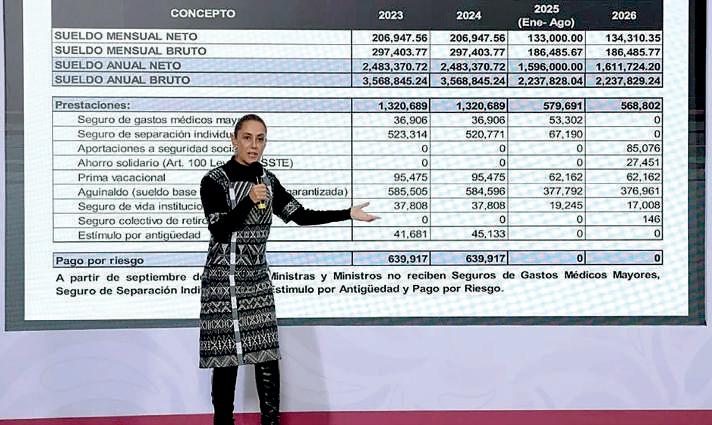 EXCESOS DE LA VIEJA CORTE Tras el escándalo por la adquisición de camionetas blindadas para los ministros de la nueva Corte, que después fueron devueltas, la presidenta Claudia Sheinbaum aseguró que ahora ya se acabaron los excesos. Exhibió un listado de “privilegios” a los que los actuales ministros renunciaron, y que los ex miembros de la Corte disfrutaron; por ejemplo, ganar más que el presidente, megaguinaldo, pago de telefonía por más de 1 millón de pesos, apoyo de alimentos, reparación de refris, despensas, pipas de agua y etc., etc… etc. Pág 6