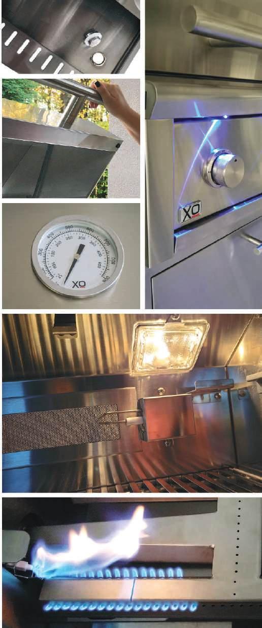 That is why all XO grills employ heavy duty, welded stainless steel construction, easy lifting spring counterbalenced hoods, reliable flame thrower ignition, elegant and practical lighting inside and out, massive grates for strong grill marks and convenient tilt to store upper racks.