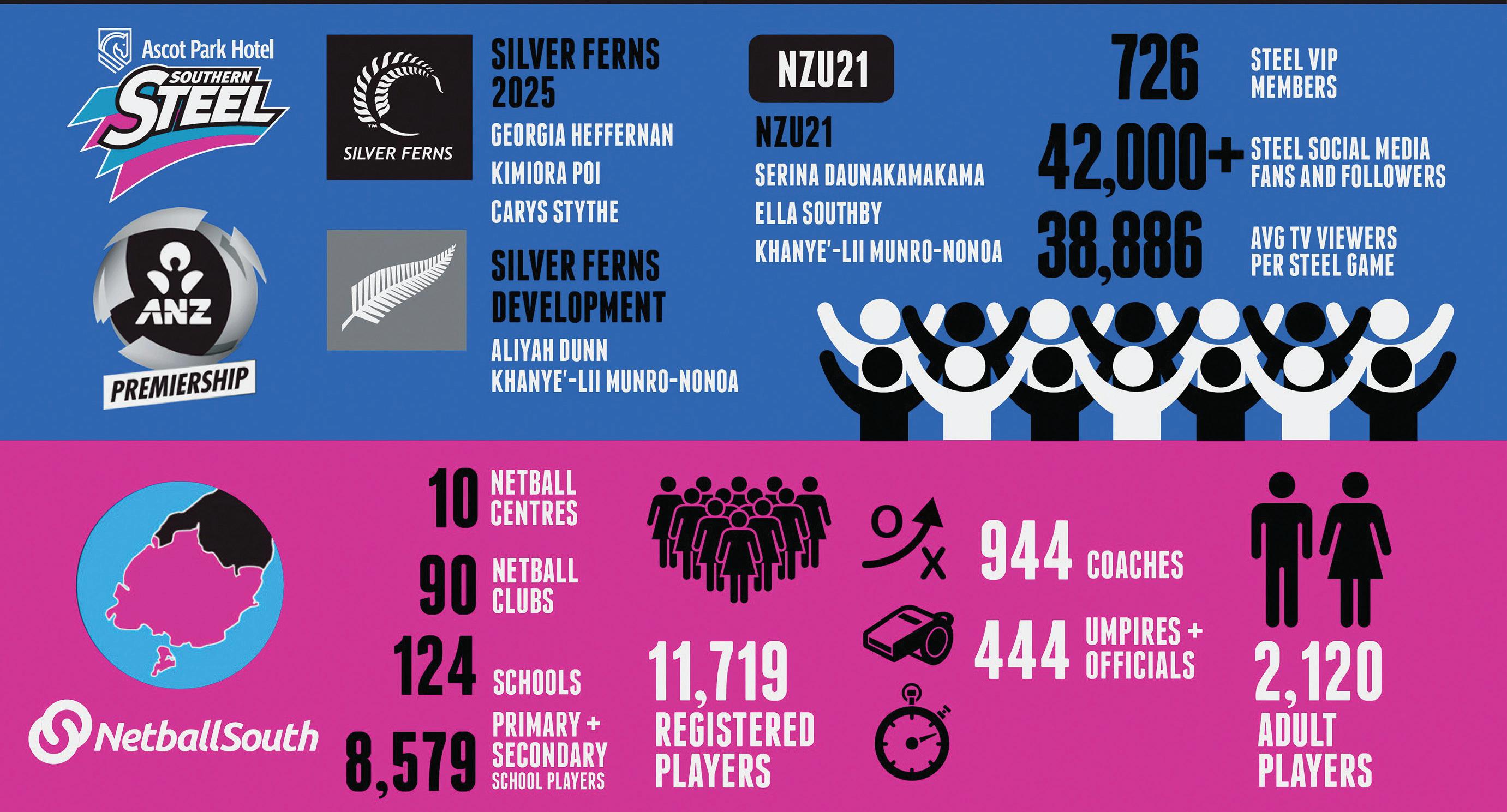 On a high performance front, the 2025 ANZ Premiership season was the start of a new era for the Ascot Park Hotel Southern Steel. Two Steel icons returned to guide the team, local legend Wendy Frew in her first year as head coach and internationallyacclaimed coach Liana Leota as our assistant coach. Together, they formed a formidable partnership that revitalised our franchise and restored our competitive edge. Their commitment, expertise and leadership was nothing short of outstanding.