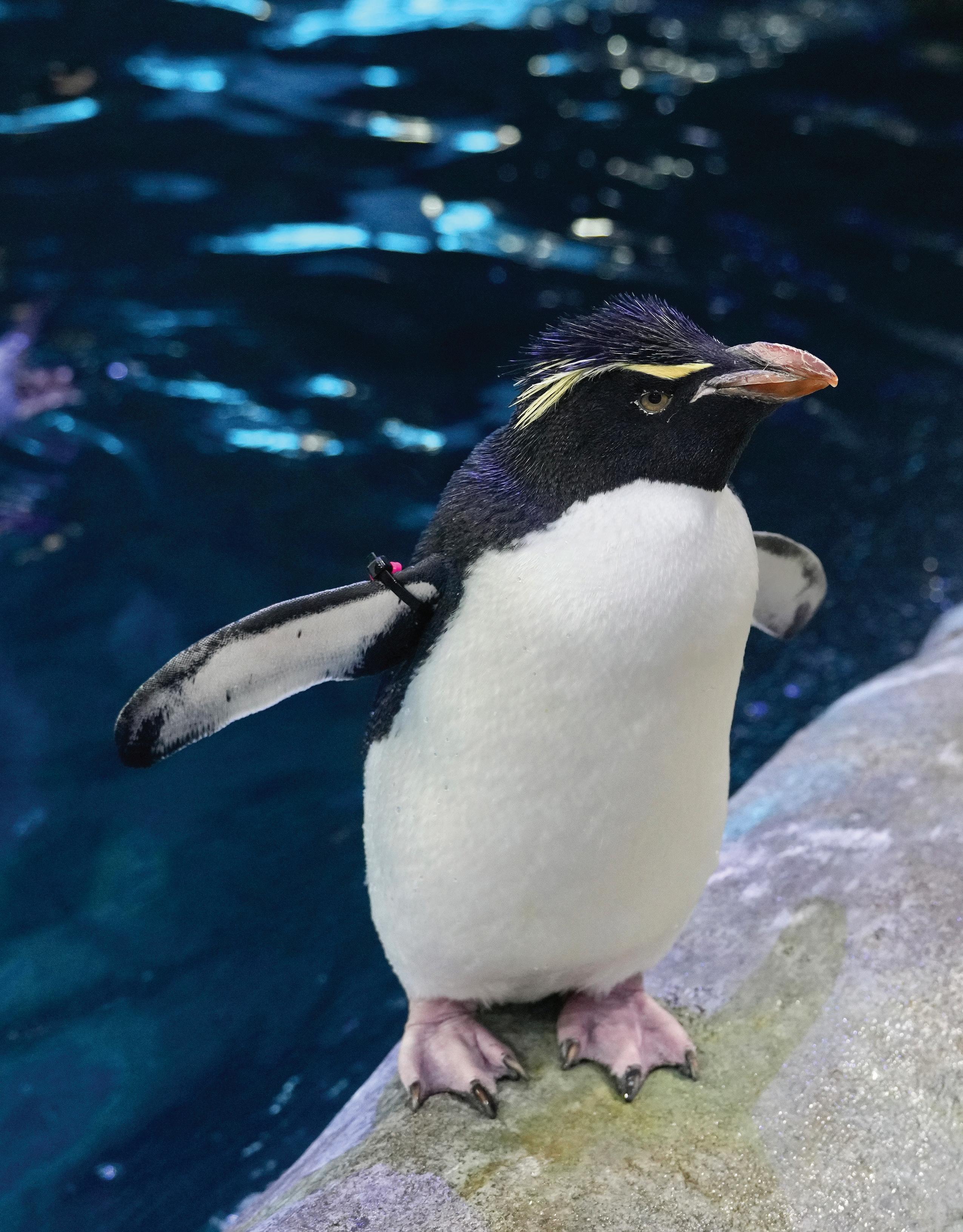 Look for a rockhopper with black and pink arm bands! These bands are humanely used to identify the penguins and ensure they receive specialized, individualized care.