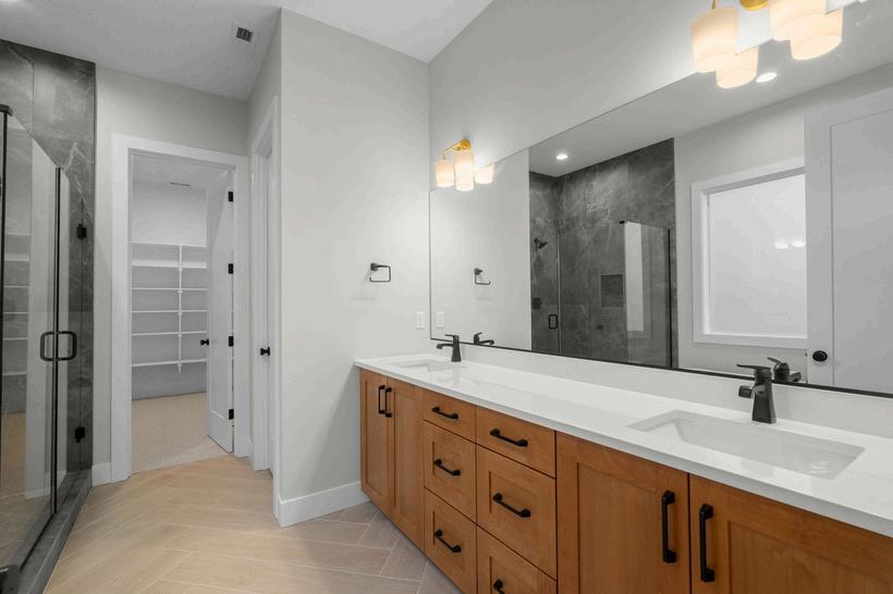 Slab counters and dual undermounted white square sinks, vary per plan
