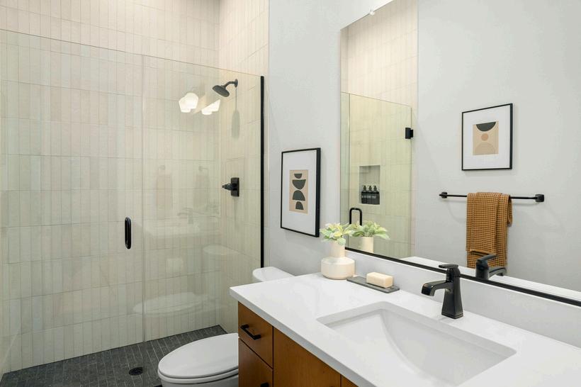 Frameless mirrors over vanity and black towel bars