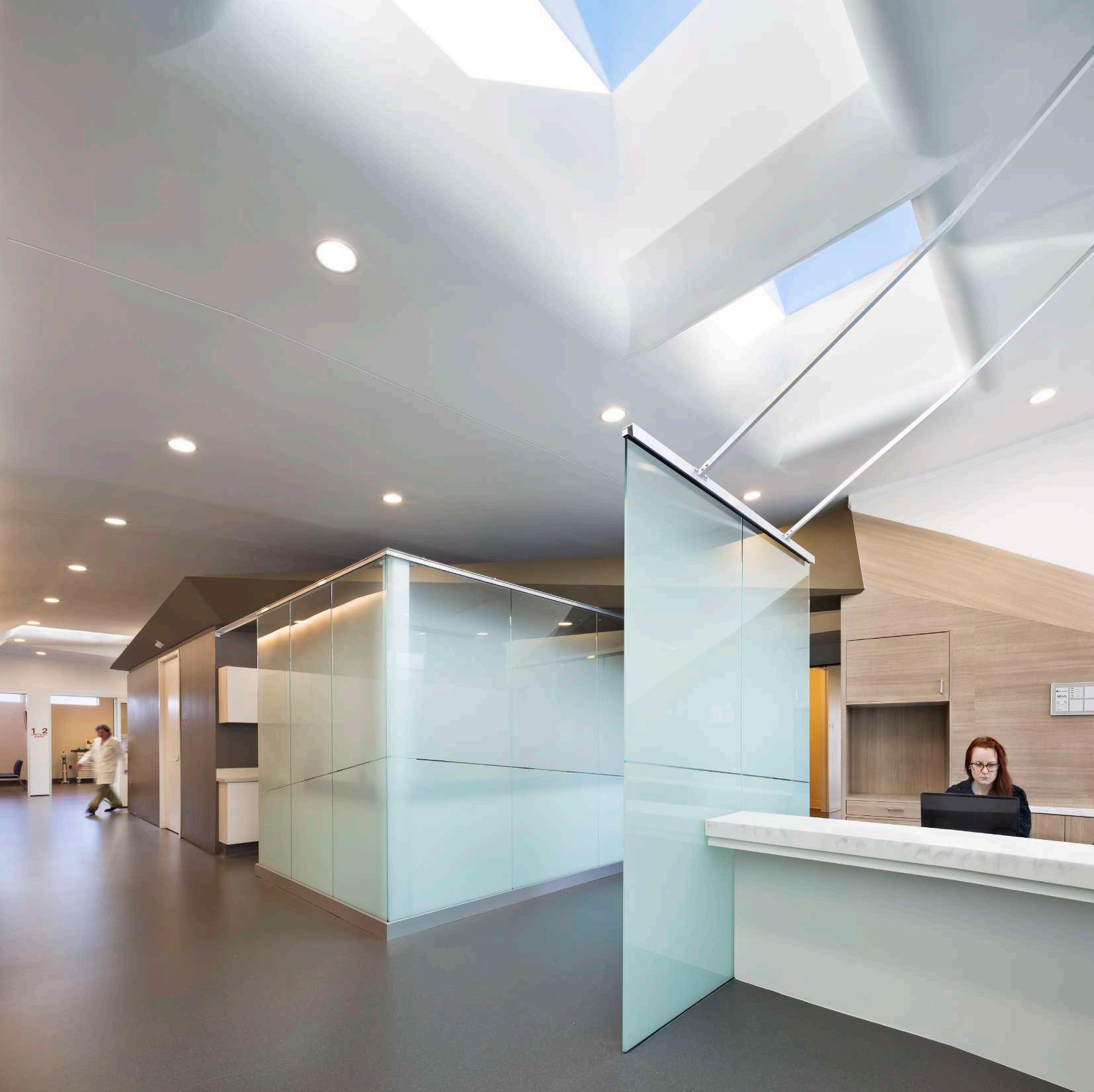 We wanted the entrance to feel like an experience. Lined with skylights the maple wood walls lead you into the space until you arrive at a live moss wall (that purifies the air and makes your heart smile). The backdrop is a polycarbonate wall that is lined with LED color-changing lights. This wall has their logo “a paper airplane.” Now that this project is done, our wishes are that with every project they do, they go further and make people smile, just like a paper plane.
