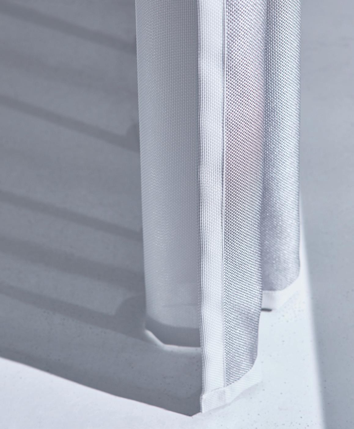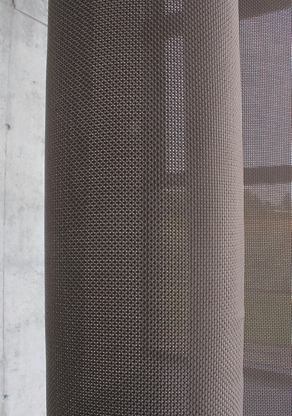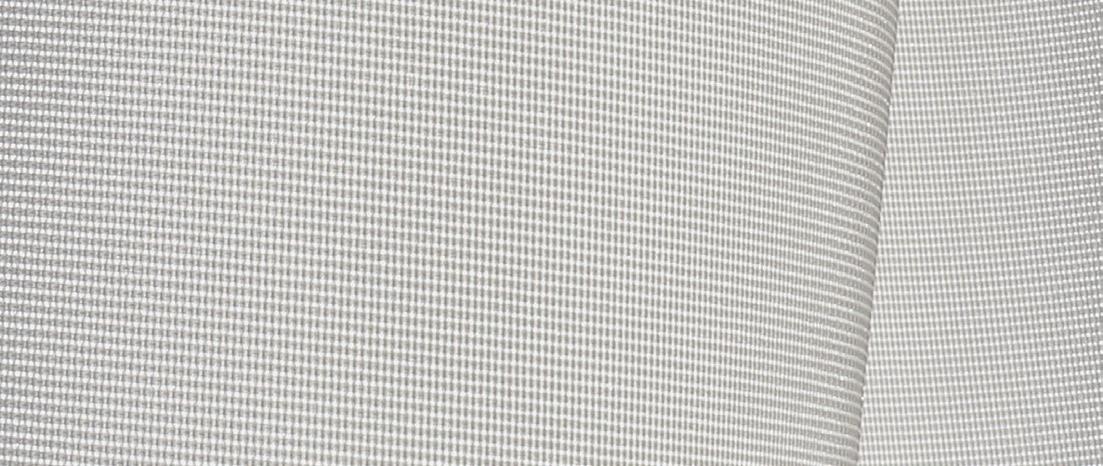 格子状の織りデザインが特徴の生地の裏面にメタライズ加工 をしています。これまでの製造過程を改良することで285 cm の広幅が実現し、性能もより高くなりました。織りの構造により 室内に十分な自然光を取り込む一方で、強い日差しとまぶしさ から室内を保護します。