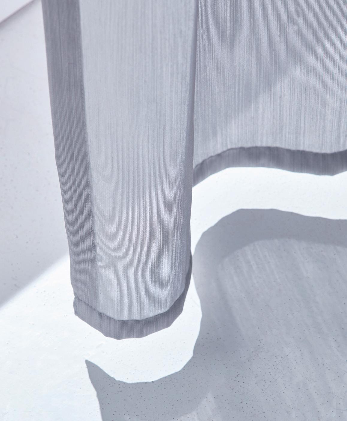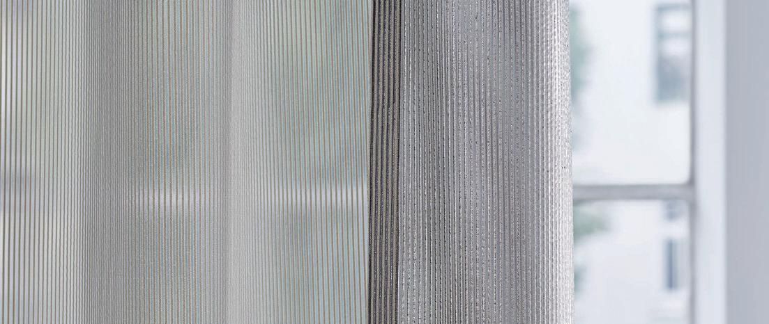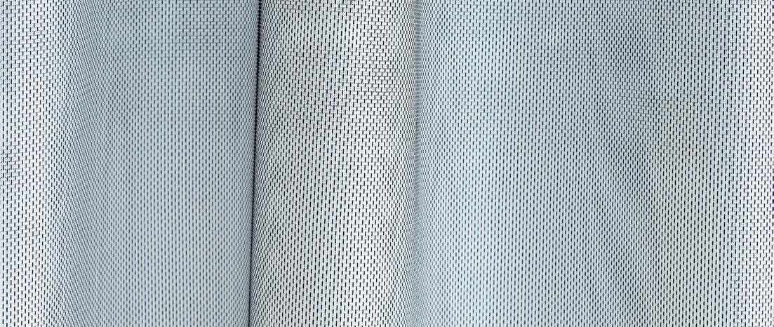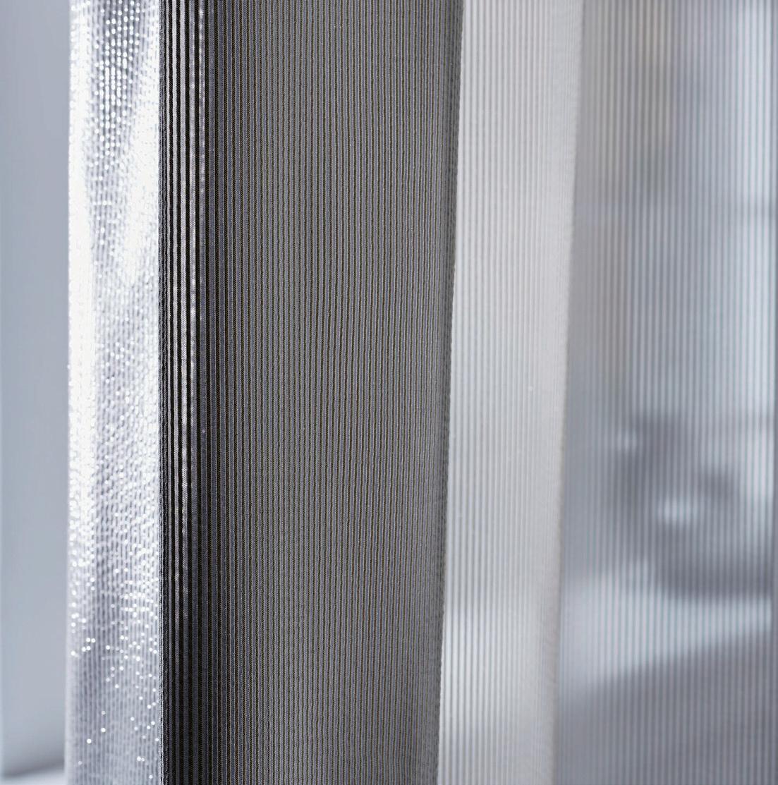 繊細なストライプの織りが特徴のファブリックです。フィラメン ト糸でニッティングすることで、透明感を出し、裏面にはアル ミニウムでメタライズ加工を施しています。テクニカルなデザ インと高い透明性を備え、強い日差しと眩しさから空間を効果 的に守ります。