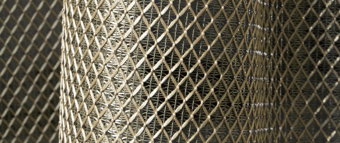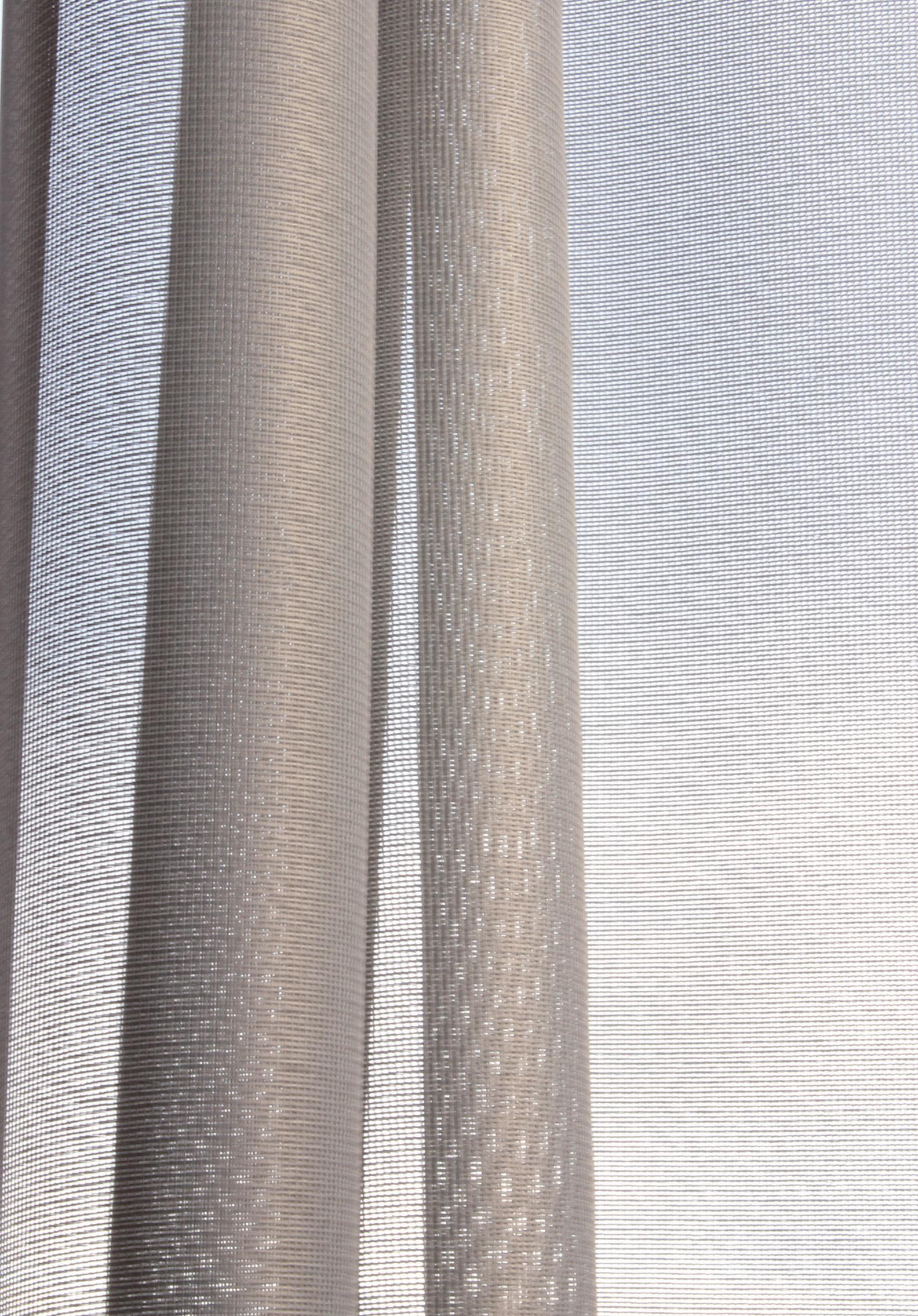 ブラス、コッパー、シルバーなどコンテンポラリーなメタルカ ラーの糸でニッティングしたメッシュ生地の裏面にアルミニウ ムでメタライズ加工を施しています。光を最適に反射させなが ら、高い遮熱機能と優れた透明性を実現します。きらめく色調 と、しなやかなドレープ性が特徴です。