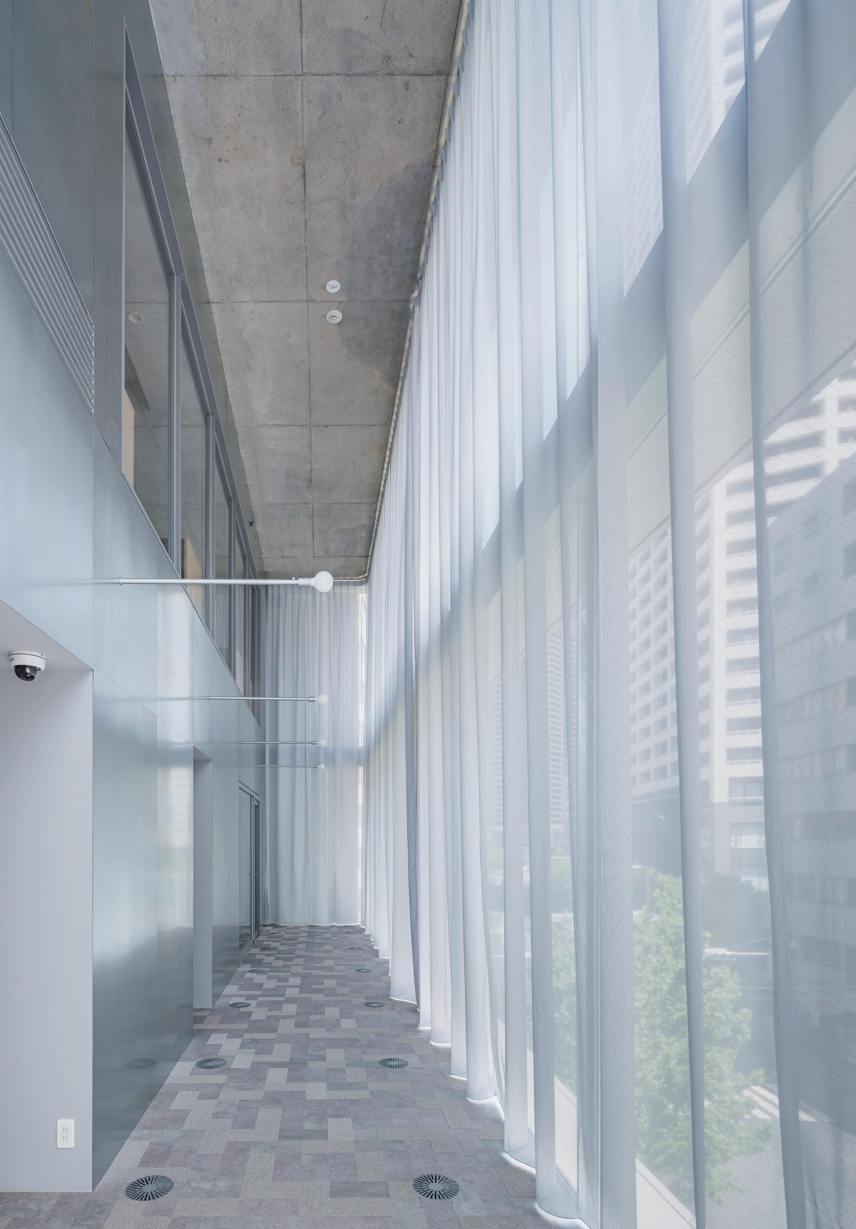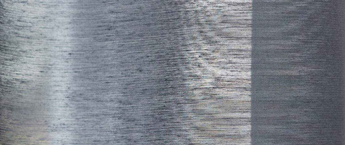 織りあげた生地を染色した後にアルミニウムでメタライズ加 工を施したカーテンファブリックです。繊細な織りとソフトな 手触りが特徴です。公共空間はもちろん一般住宅でも、最適 なグレア防止として様々なシーンでお使いいただけます。