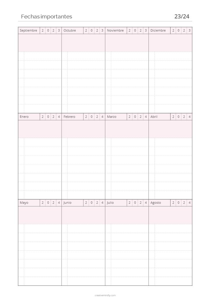 El cuaderno viene con 4 programaciones semanales diferentes, con las fechas puestas para todo el curso, pero podrás cambiar las fechas, los días, para que el cuaderno se convierta en el cuaderno del año que tú quieras. Al ser editable, si quieres que la parte de programación no esté dentro del cuaderno, podrás imprimirla aparte. Esto lo explico en los vídeos que acompañan al cuaderno.