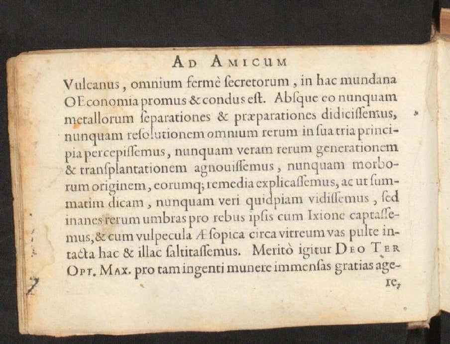 Vulcanus, omnium ferme fecretorum, in hac mundana OEconomia promus & condus eft. Abfque co nunquam metallorum feparationes & praeparationes didiciffenius, nunquam refolutionem omnium rerum in fuatria principaia percepiffemus, nunquam veram rerum generationem & tranfplantationem agnouiffemus, nunquam morborum originem, eorumq; remedia explicaffemus, acur fummatim dica, nunquam veri quidpiam vidiffemus, fed inanes rerum umbras pro rebus ipfis cum Ixione captaffemus, & cum vulpecula A fopica circa vitreum vas pulte intacta hac & illac faltitaffemus. Merito igitur DEO TER