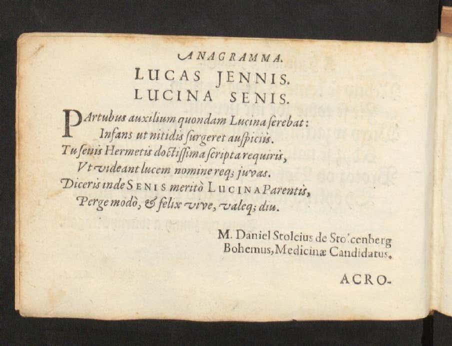 ANAGRAM LUKE JENNIS. OLD LIGHT. Lucina was once a strong supporter As the child stole away with his bright eyes You seek to write the hay of Hermes do Ethyphma, Let them see the light of the name of God. You will then be called the OLD LUCINA PARENT, Let me go on, and live happily, good-bye; for a long time M. Daniel