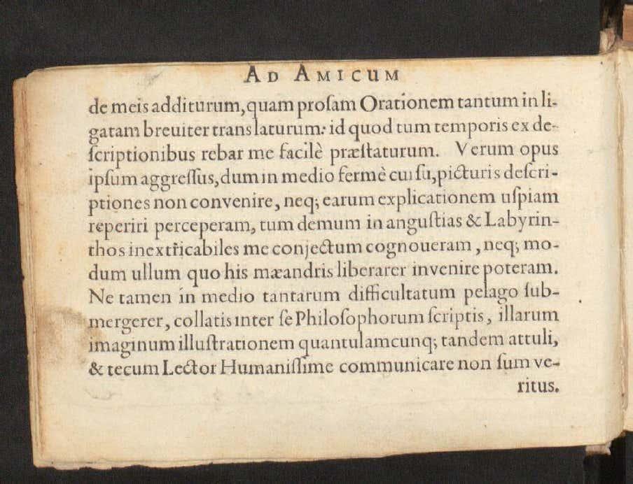 de meis additurum, quam prolam Orationem tantum in ligatam breuiter trans laturum: id quod tum temporis ex delcriptionibus rebar me facile praeltaturum. Verum opus ipfum aggreffus, dum in medio ferme cu fu, picturis defcriptiones non convenire, neq: earum explicationem ufpiam reperiri perceperam, tum demum in angultias & Labyrinthos inextricabiles me conjectum cognoueram, neq: modum ullum quo his meaandris liberarer invenire poteram. Ne tamen in medio tantarum difficultatum pelago lubmergerer, collatis inter fe Philolophorum lcriptis, illarum imaginum illuftrationem quantulamcunq: tandem attuli, & tecum Lector Humanillime communicare non fum veritus.