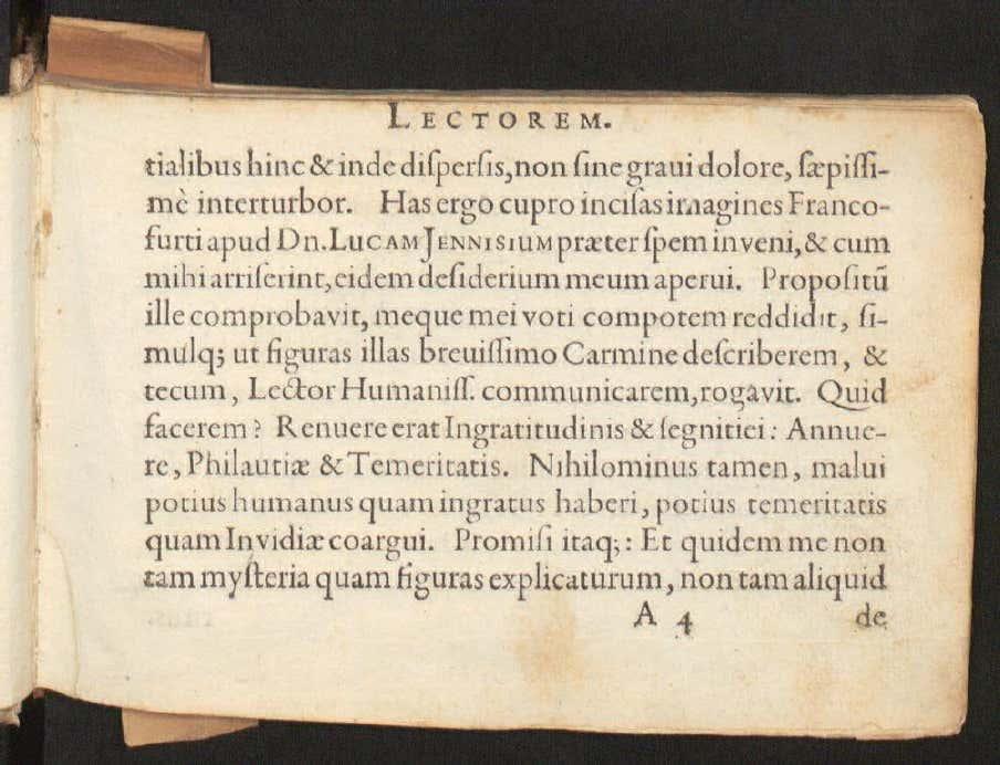 tialibus hinc& inde dilperlis, nonline graui dolore, laepillime interturbor. has ergo cupro incilasimagimes Francofurti apud Dn. LUCAM JENNISIUM praeter lpem inveni, & cum mihi arrilerint, eidem deliderium meum aperui. Propolitu ille comprobavit, meque meivoti compotem reddidit, flmulq: ut figuras illas breuiffimo Carmine delcriberem, & tecum, Lector Humaniff. communiccarem, rogavit. Quid facerem? remuere erat Ingratitudinis & fegnitiei: Annuere, Philautiae & Temeritatis. Nihilominus tamen, maluipotius humanus quam ingratus haberi, potius temeritatis quam Invidiae coargui. Promifi itaq:; Et quidem me non tam myfteria quam figuras explicaturum, nontam aliquid