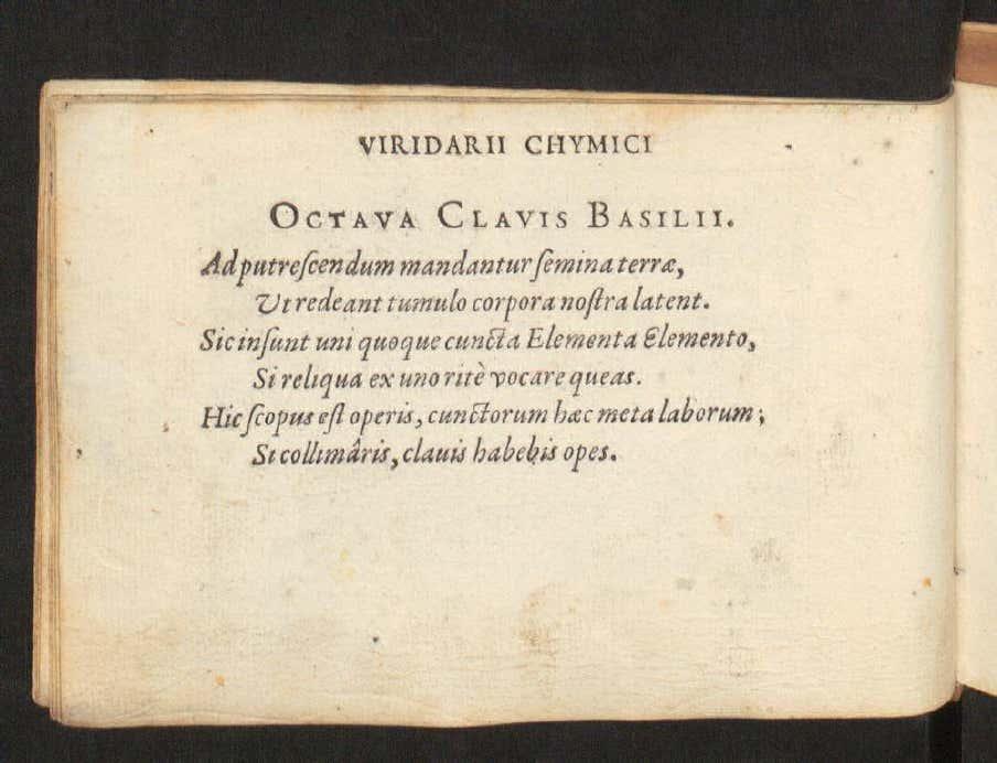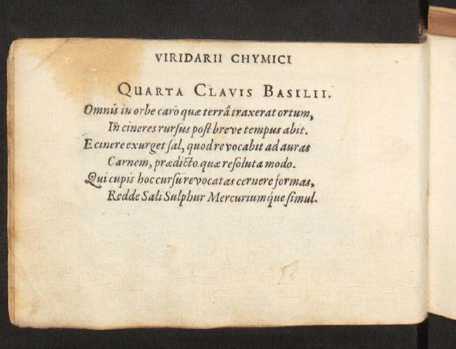 GREEN CHEMICALS BASIL'S FOURTH KEY All the flesh in the world that had been born It will take a short time to burn the ashes. Salt will rise from the ashes, which he will call back to gold The flesh, after having been resolved, Those who wish to look for the forms mentioned here, Return the Sulfur Salt and the Mercury at the same time.