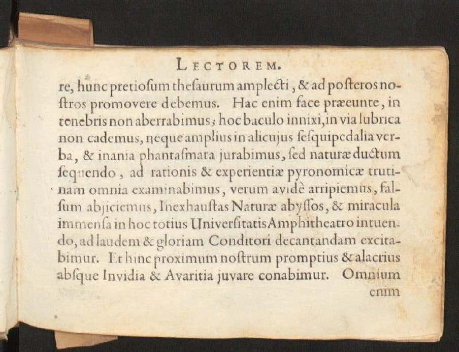 re, hunc pretiofum thefaurum amplecti, & ad pofterosno-ftros promovere debemus. Hac enim face praeeunte, in tenebris non aberrabimus, hocbaculo innixi, in via lubrica non cademus, neque amplius in alicujus fefquipedalia verba, & inania phantafmata jurabimus, fed naturae ductum fequendo, ad rationis & experientiae pyronomicae trutinam omnia examinabimus, verum avide arripiemus, falfum abjiciemus, Inexhauftas Naturae abyffos, & miracula immenfa in hoctotius univerfitatis Amphitheatro intuendo, ad laudem & gloriam Conditori decantandam excitabimur. Ethinc proximum noftrum promptius & alacrisu abfque Invidia & Avaritia juvare conabimus. Omnium enim the reader indeed, we must embrace this precious treasure, and promote it to those who desire it. For with this face, we shall not stray in the dark, leaning on this staff, we shall not fall into the slippery road, nor shall we any longer swear by anyone's false words and empty phantoms; we shall throw away the inexhaustible abyffs of Nature, and by looking at the immense miracles in the Amphitheater of this universality, we shall be awakened to sing the praise and glory of the Founder. Therefore, we will try to help our neighbor more readily and eagerly, without envy and avarice. For everything