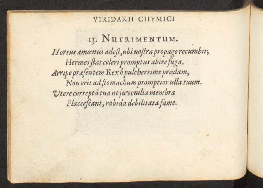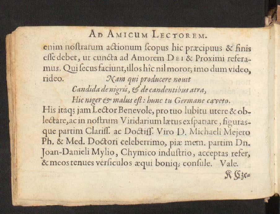 • His itaq; jam Lector Benevole, pro tue lubitu utere & oblectare, ac in noftrum Viridarium laetus exfpatiare, figurasque partim Clariff. ac Doctiff. Viro D. Michaeli Mejero Ph. & Med. Doctori celeberrimo, pix mem. partim Dn. Joan-Danieli Mylio, Chymico induftrio, acceptas refer, & meostenues verficulos aequi boniq; confule. Vale.