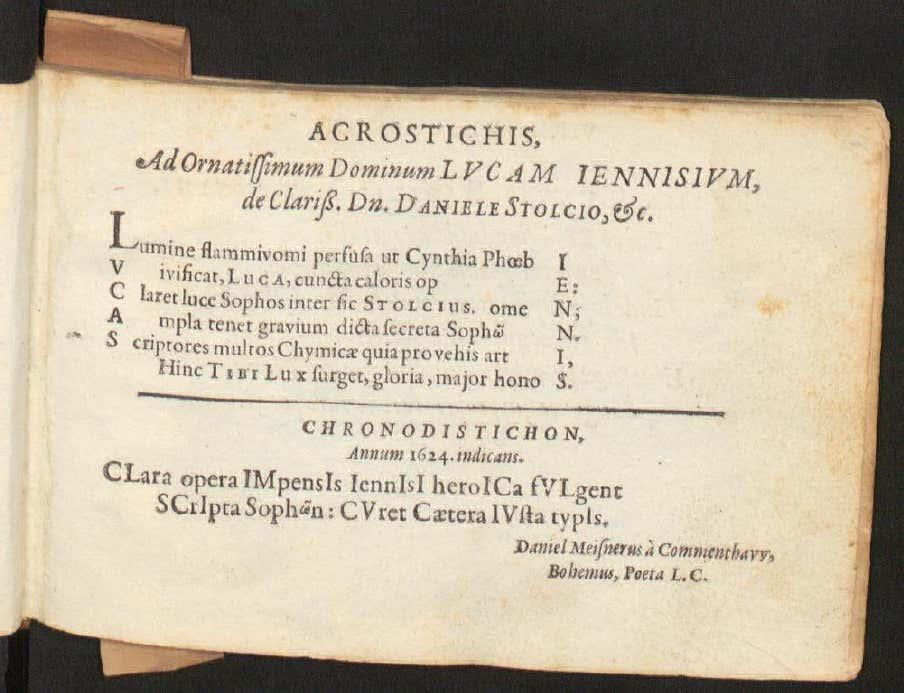 acrostic To the Ornate Lord LVCAM IENNISIVM, of Clarifs. Mr. DANIEL STOLCIUS, &c. Cynthia Phaeb I was bathed in a fiery light V revives, LUCA, all the heat op E: