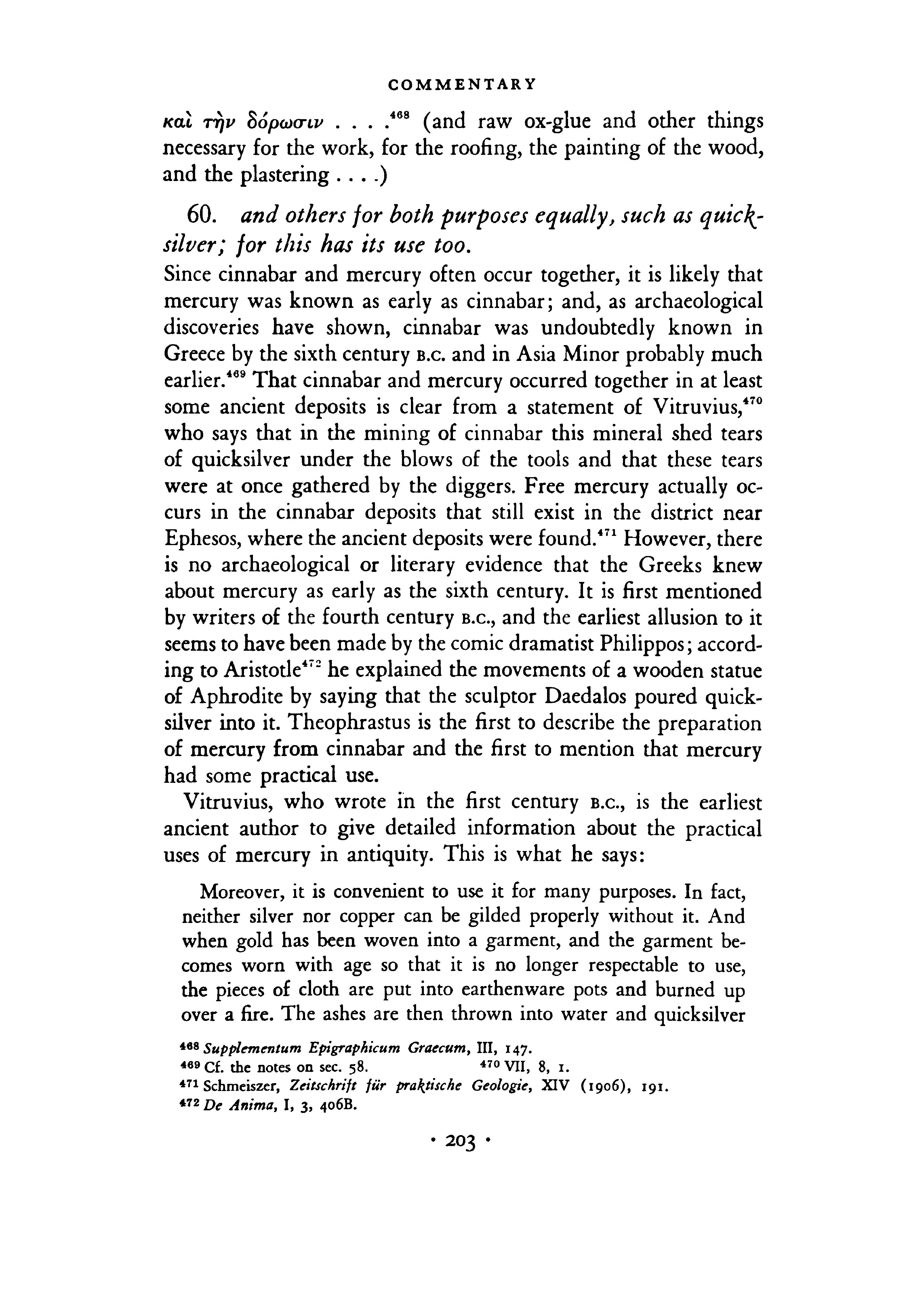 Stories or illustrative statements: attempt of Caligula to obtain gold from orpiment, 200; discovery by Kallias of a method for refining cinnabar, 58, 198-202; discovery by Kydias of a method of making red ochre, 56, 181-82; fire on a ship caused by gypsos, 60, 219-20; huge green stones, 50, 100-102, 103-104; origin of lyngourion, 51 , 111-12, 11316; wonderful stone found in the gold mines at Lampsakos, 52, 129-30