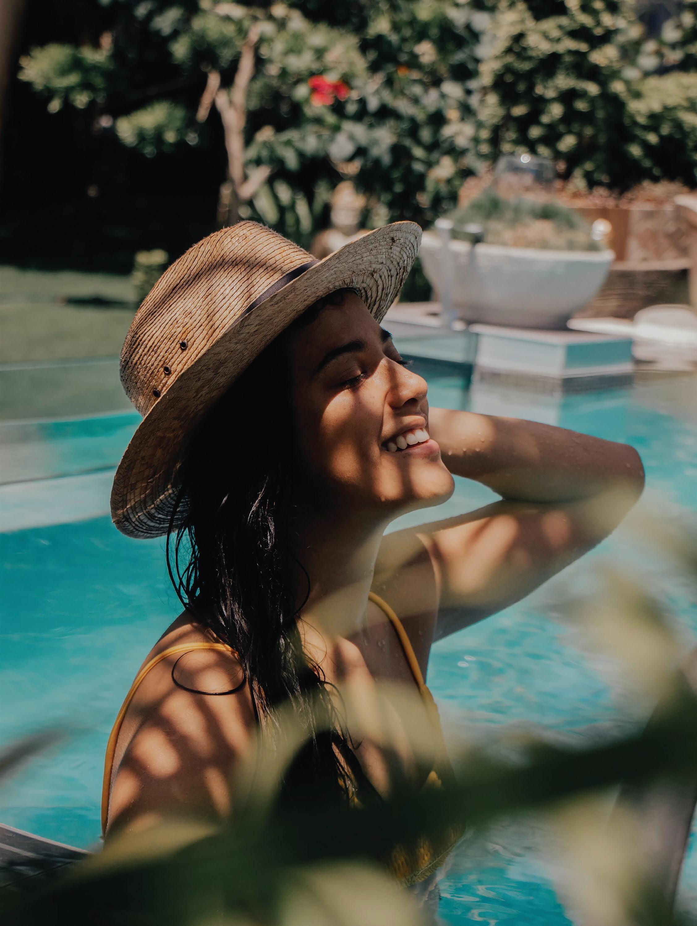 9. Saltwater pool surrounded by cabanas and loungers with in-pool chaise loungers