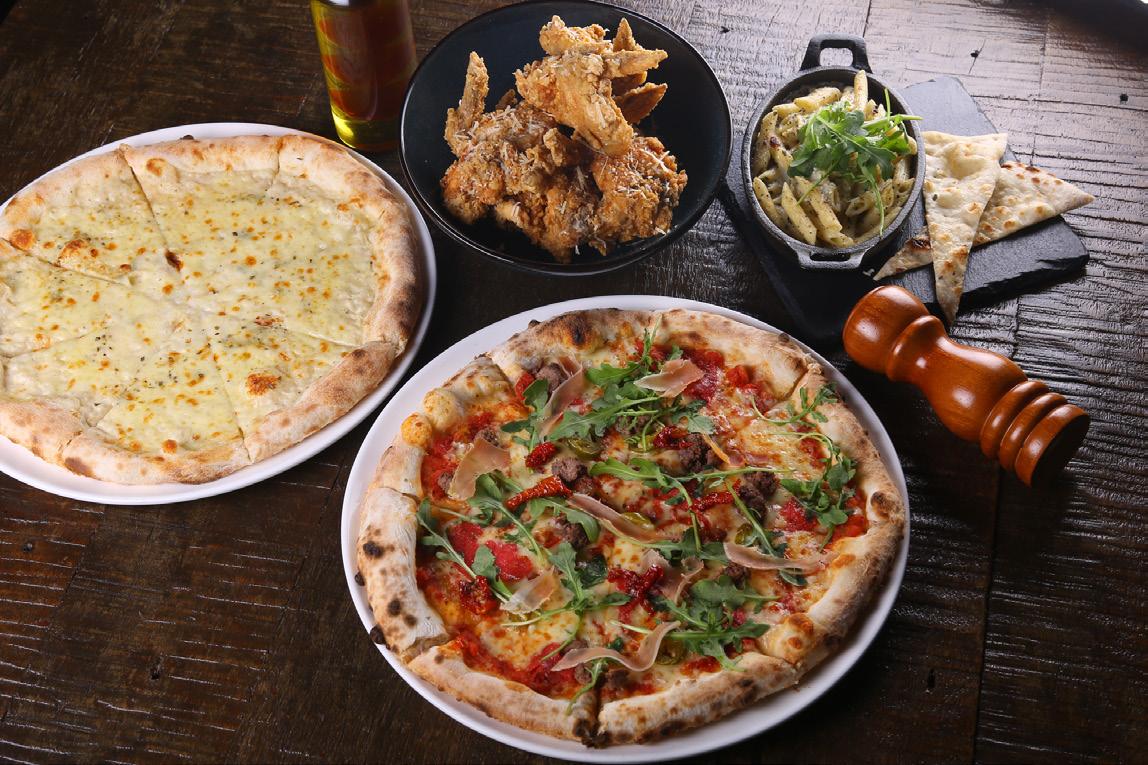 Enjoy a classic and a signature pizza paired with a generous platter of tru ed pasta and Parmesan-coated chicken wings paired with a sumptuous garlic aioli.