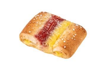 Danish butter dough pastries with strawberry and cream cheese filling, decorated with pearl sugar.