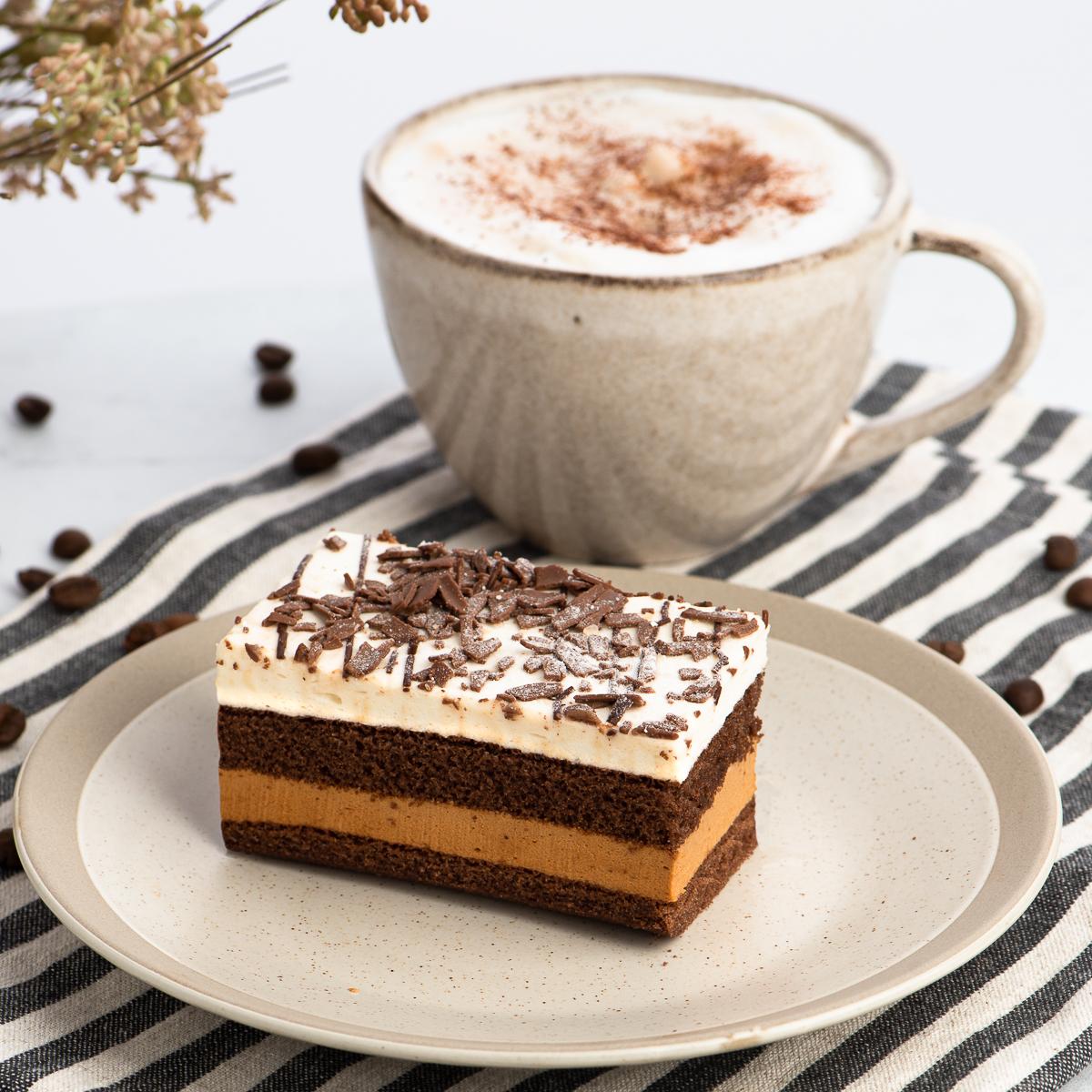 Coffee mousse between cocoa sponge bases and vanilla-flavored whipped cream on top. Decorated with chocolate truffle stripes, milk chocolate pieces and powdered sugar.