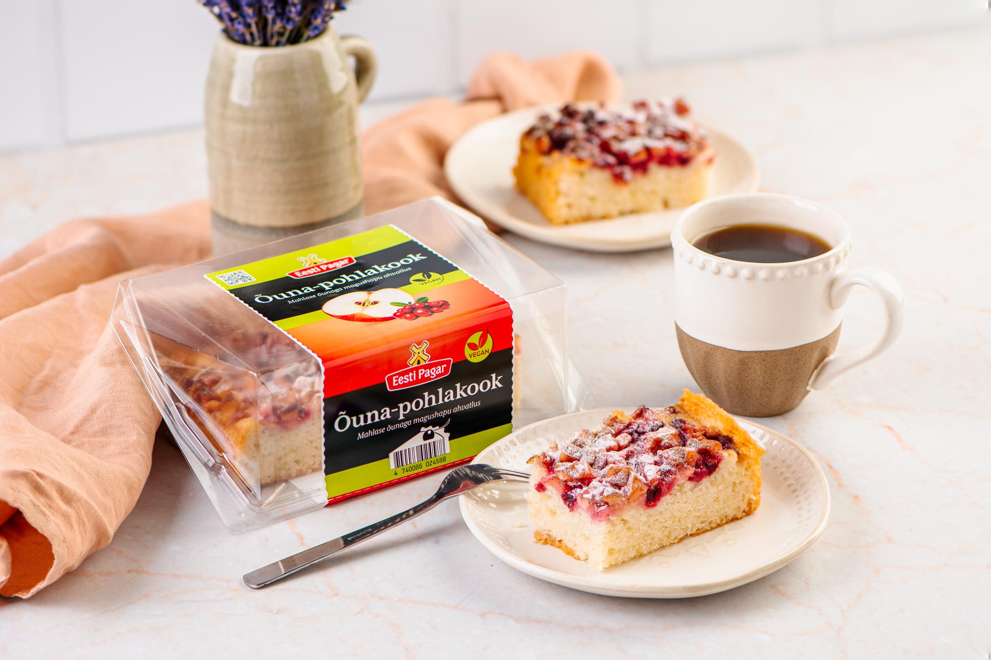 Baked pound cake, covered with apple pieces and tart lingonberries, seasoned with sugar and cinnamon sprinkles. Powdered sugar for decoration. This cake does not contain animal ingredients and is suitable for vegans.
