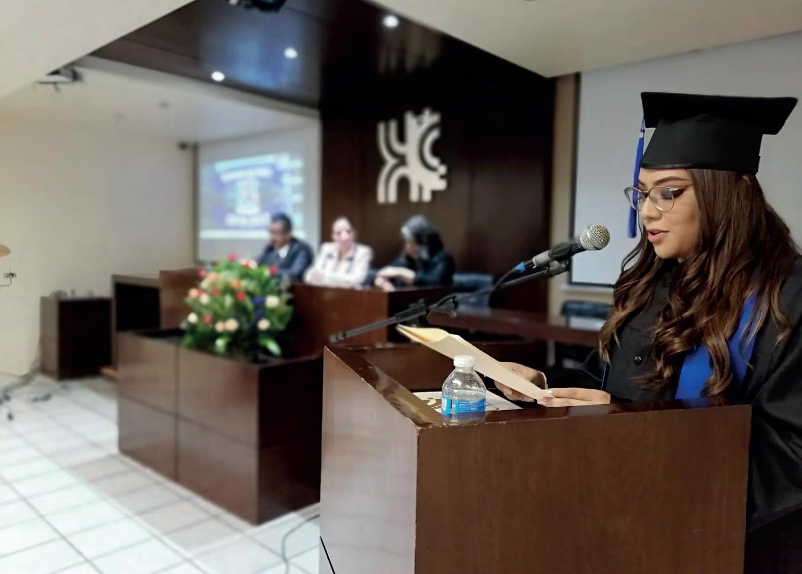Por otra parte, la alumna Hiram Ramírez Cortez dio un mensaje de agradecimiento a quienes fueran sus docentes por las tantas enseñanzas, a sus compañeros por los momentos compartidos; así mismo les deseó éxito en sus diversos caminos y concluyó agradeciendo a la Universidad por su formación profesional.