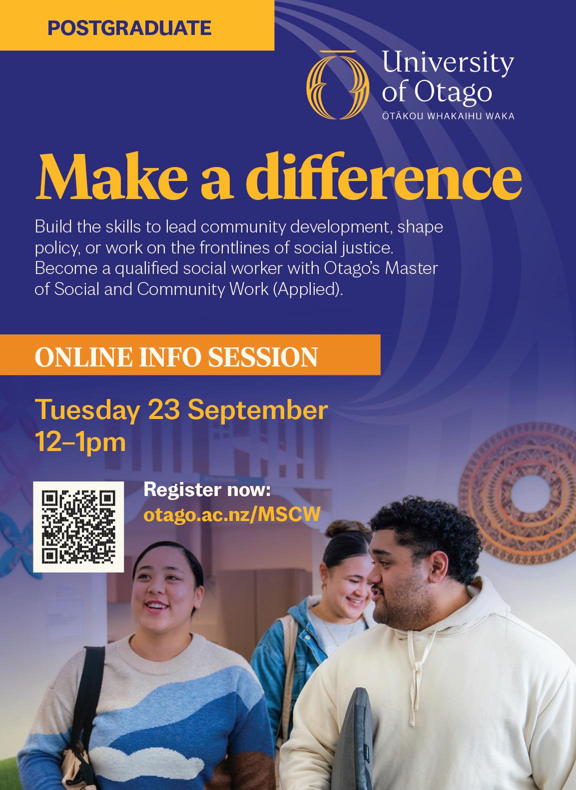 OUSA Executive Nominations have closed and campaigning has started. Start having a look at who you want to vote for! A Givealittle page has been set up to support Otago tauira Jayden Broome’s whānau after an accident. Scan QR code to donate.