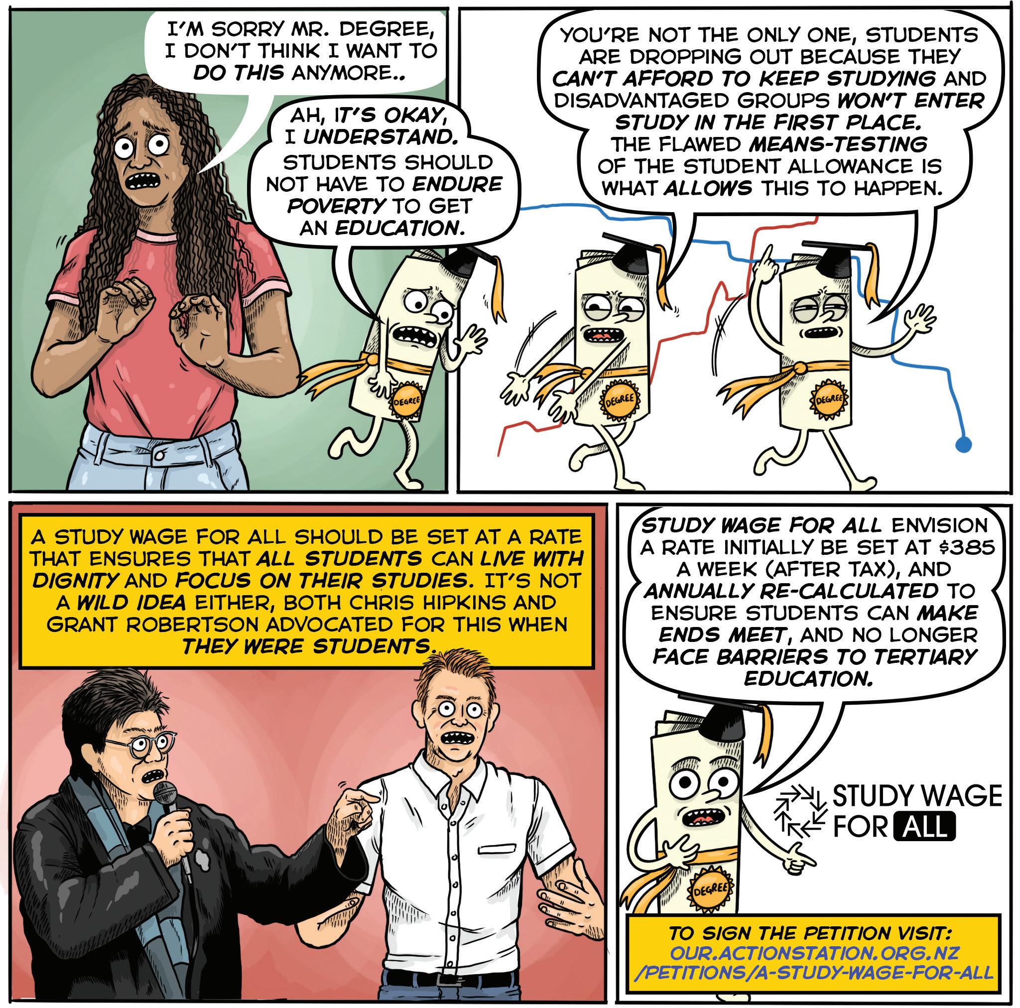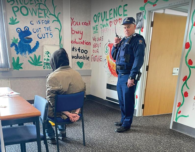 profit-driven destruction of student life”, “their closed-off meetings and high salaries”. Simply put, the students were “fucked off over all of it.” The protest was in conjunction with the Stop the Cuts Movement at Victoria University which held a mock funeral for tertiary education on Tuesday. This comes as two students at Massey University were allegedly trespassed for chalking “Stop the Cuts” and other slogans while it was raining. Talk about property damage.