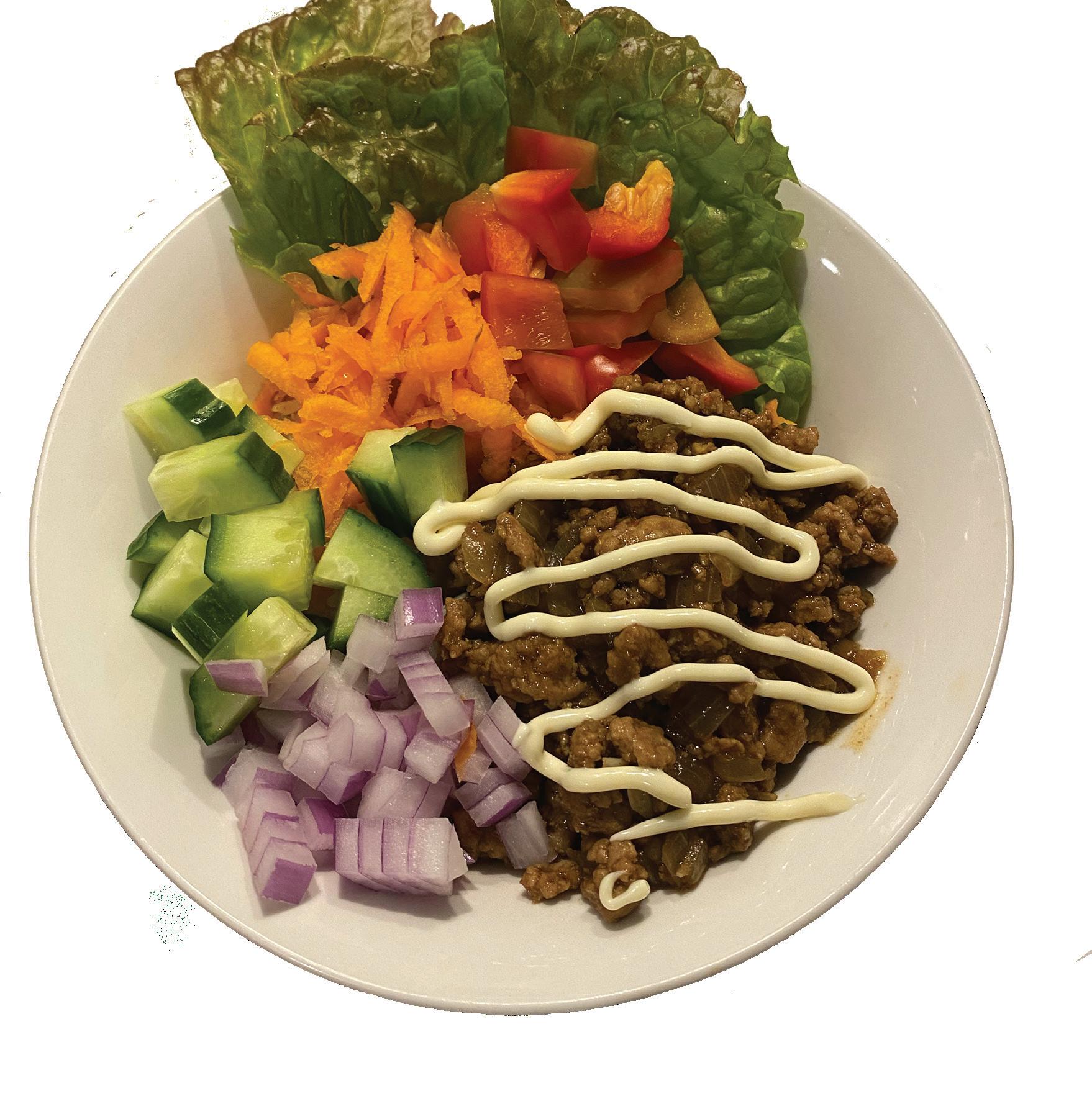 - On rice with fresh vegetables and kewpie mayo