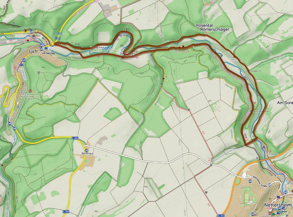 Deze route voert door het dal van de Urft tussen Urft en Nettersheim. Dit beekdal in het hart van de Sötenicher Kalkmulde kent een rijke kalkflora. De warme, beschutte ligging zorgt ervoor dat het dal van de Urft een van de beste vlindergebieden van de Eifel is. In het dal zijn meer dan zestig soorten dagvlinders en bloeddropjes waargenomen, waaronder vele zeldzame soorten. Het begin en het eind van deze route lopen door bossen en zijn schatkamers voor de flora. Op de hellingen liggen kalkbeukenbossen en kalkgraslanden. In de meander van de Urft bij Gut