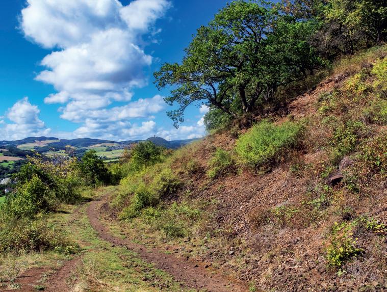 De hellingen van de Bausenberg bestaan uit vulkanisch gesteente dat makkelijk in de zon opwarmt (boven). Dit maakt ze perfect voor sprinkhanen, waaronder zelfs een populatie van de Europese bidsprinkhaan (onder).
