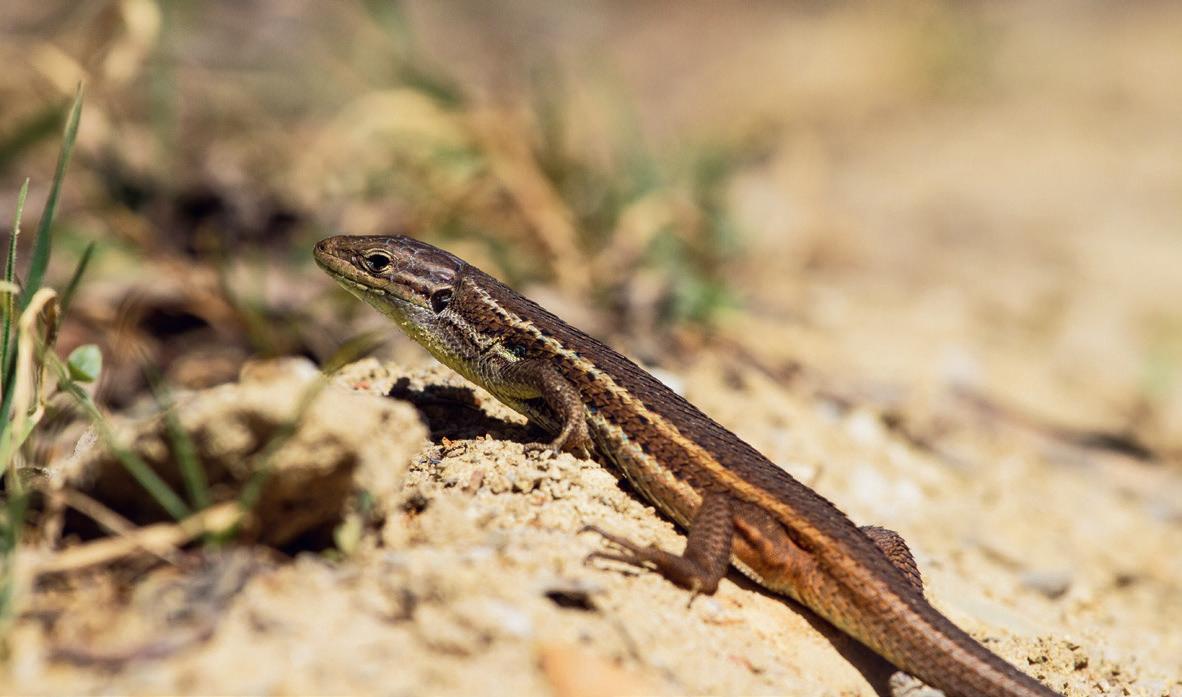 The Large Psammodromus, easily recognisable by the olive-brown back and cream stripes, is the most-seen lizard in Extremadura (right).